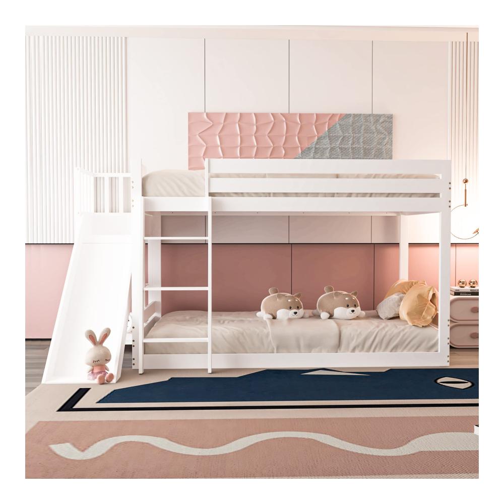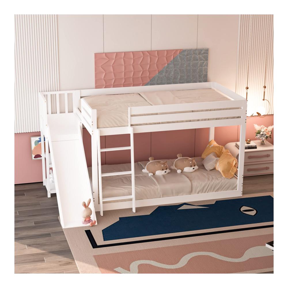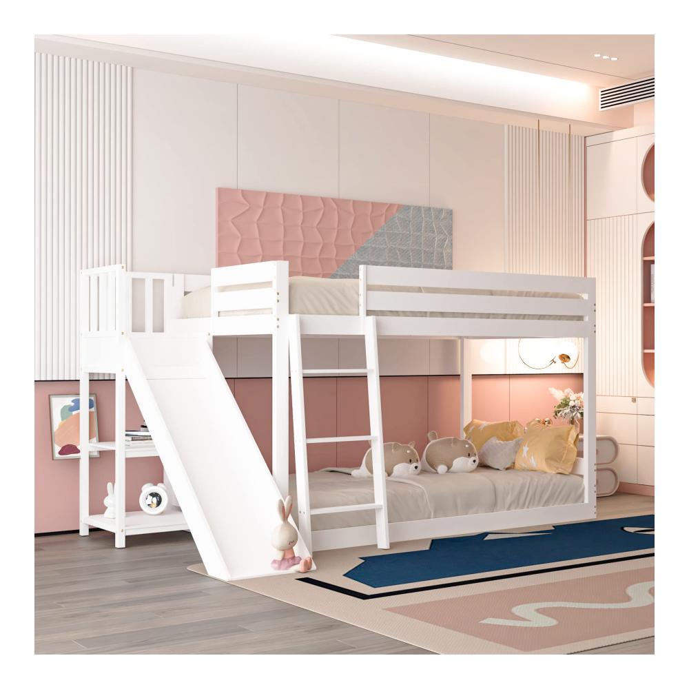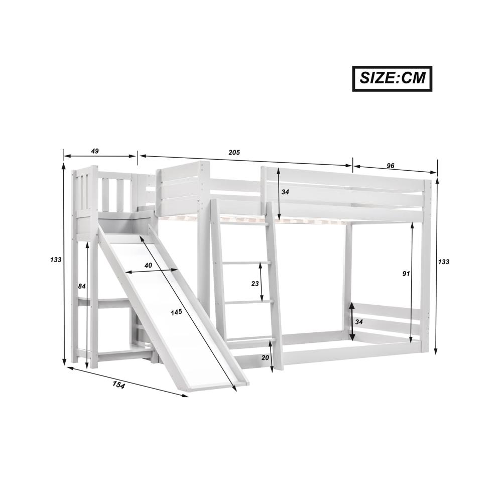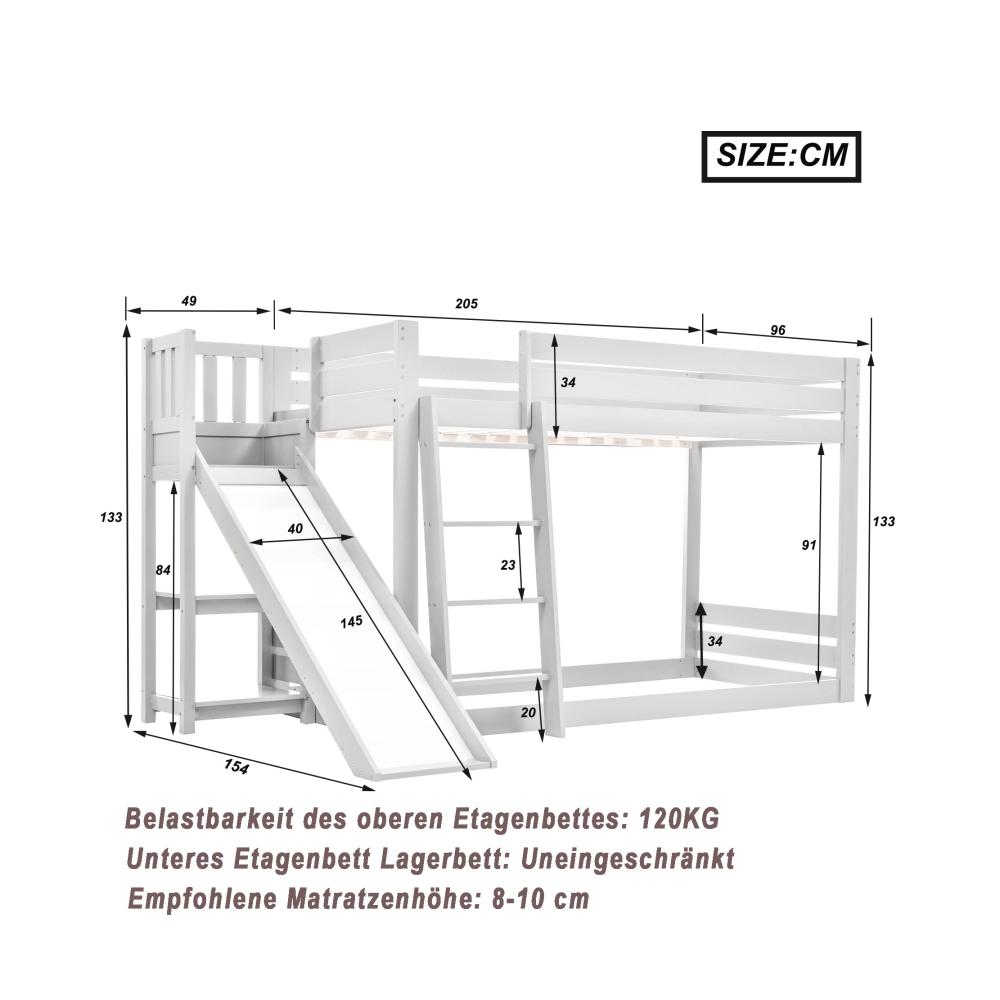 Dieses klassische doppellagige Kinderbett mit Regalen besteht aus hochwertigem Kiefernholzmaterial, das umweltfreundlich und stabil ist. Ihr Kind kann die Leiter zum Ein- und Aussteigen verwenden oder die Rutsche verwenden, um bequem aus dem Bett zu rutschen. Das obere Bett hat ein erhöhtes Gitter, damit Ihr Kind in Ruhe schlafen kann. Darüber hinaus hat das untere Bett keine Lattenroste, Sie können das untere Bett in ein Spielzimmer, Lesezimmer oder einen anderen Raum verwandeln, den Sie benötigen.
