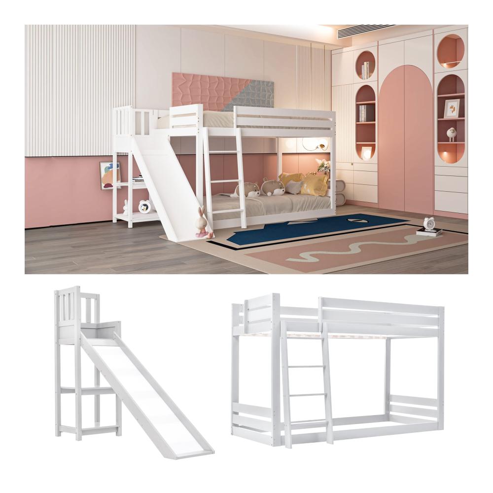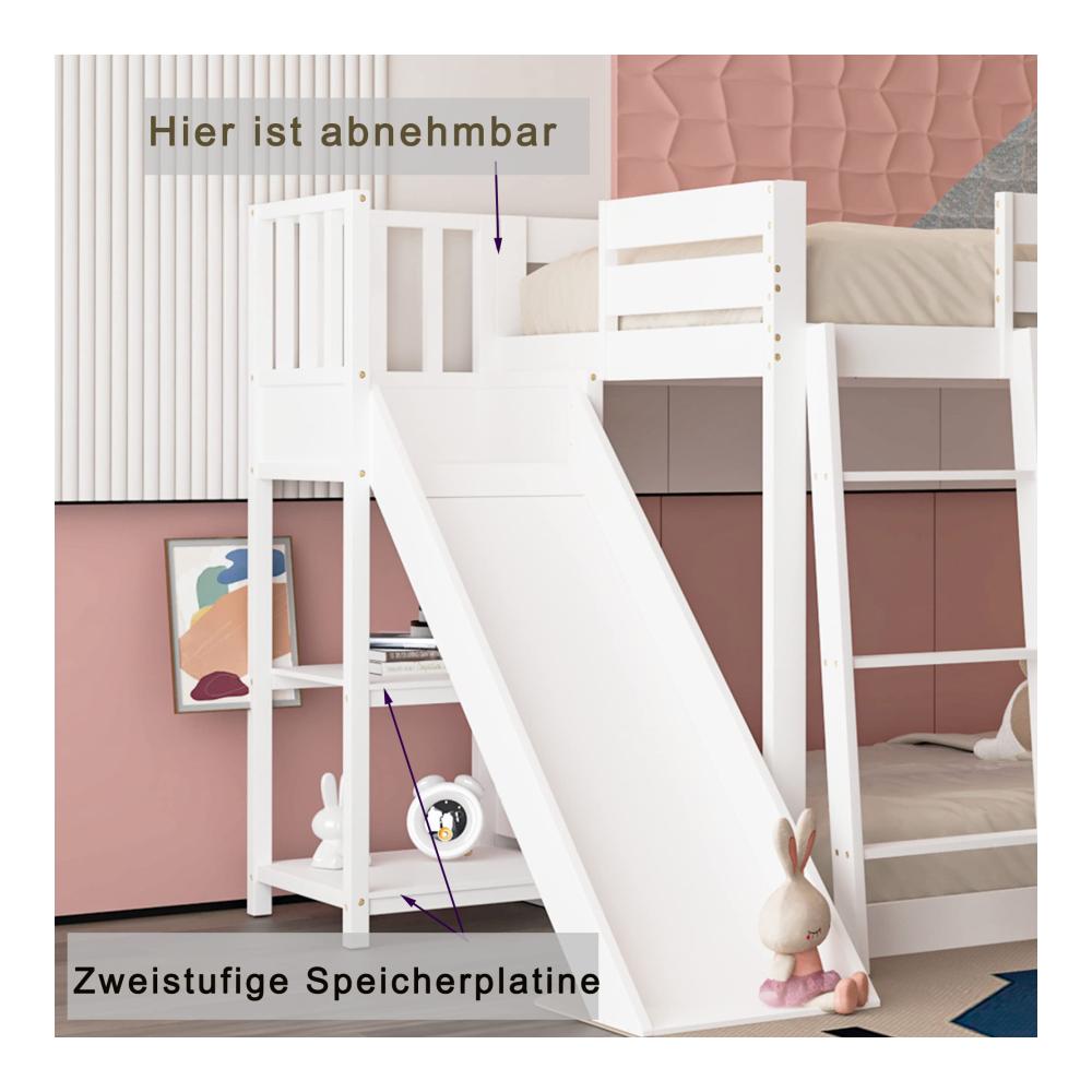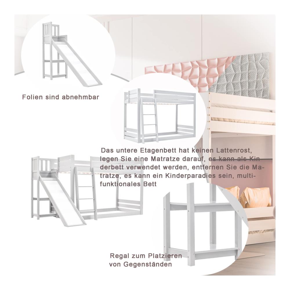 Verwandeln Sie das Kinderzimmer mit dem FEZTOY Kinderbett 90×200 in einen Ort voller Spaß und Sicherheit! Hergestellt aus hochwertigem Kiefernholz, bietet dieser Bettrahmen einen atmungsaktiven und stabilen Schlafplatz für Ihr Kind. Die mehrschichtigen Lagerregale an der Seite ermöglichen die praktische Aufbewahrung von Büchern, Spielzeug und Kleidung. Mit Kletterleitern und Rutschen wird dieses Bett zum Abenteuerspielplatz im Kinderzimmer. Das obere Bett verfügt über einen erhöhten Schutzzaun, und das untere Bett hat ein niedriges bodentiefes Design sowie Schutzgitter für zusätzliche Sicherheit. Die einfache Montage gemäß der detaillierten Bedienungsanleitung macht die Einrichtung mühelos. Machen Sie das Schlafen für Ihr Kind sicher und unterhaltsam mit diesem funktionalen Kinderbett! Kontaktieren Sie uns bei Fragen – Ihre Zufriedenheit steht an erster Stelle.