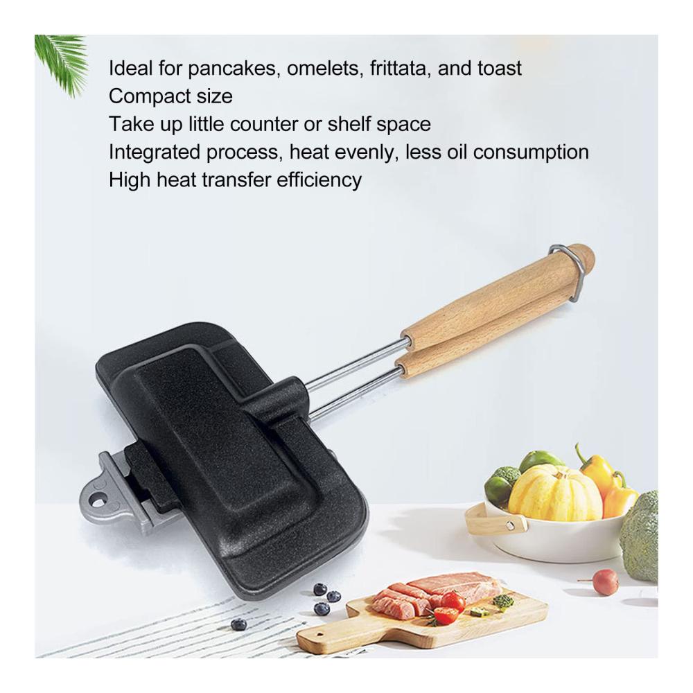 Die gleichmäßige Erwärmung und der geringe Ölverbrauch machen sie effizient. Sogar Anfänger können damit schnell köstliche Sandwiches zubereiten. Der abnehmbare Griff ist hitzebeständig und leicht zu greifen, während Haken und Schnallen für einfache Lagerung sorgen. Hergestellt aus verschleißfester Aluminiumlegierung ist sie hochtemperaturbeständig und leicht zu reinigen. Ideal für Zuhause, Küche, Café und Restaurant.</