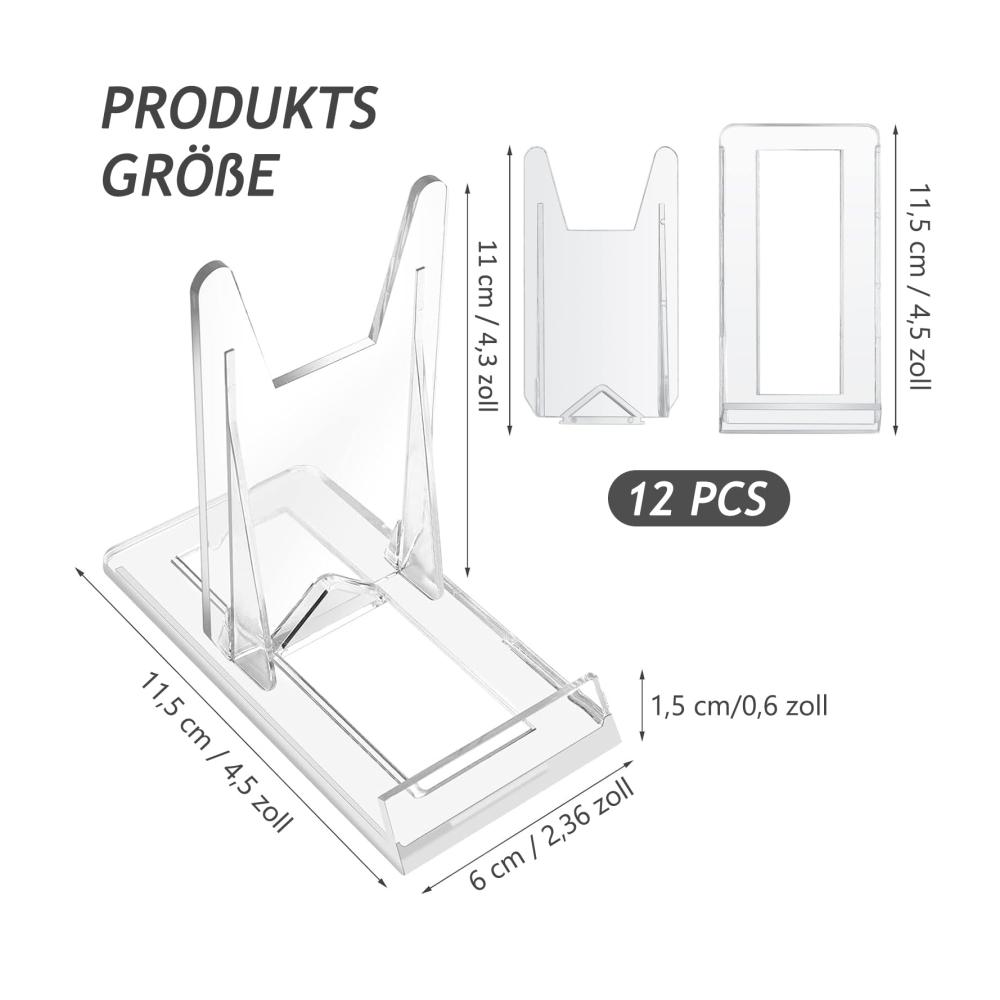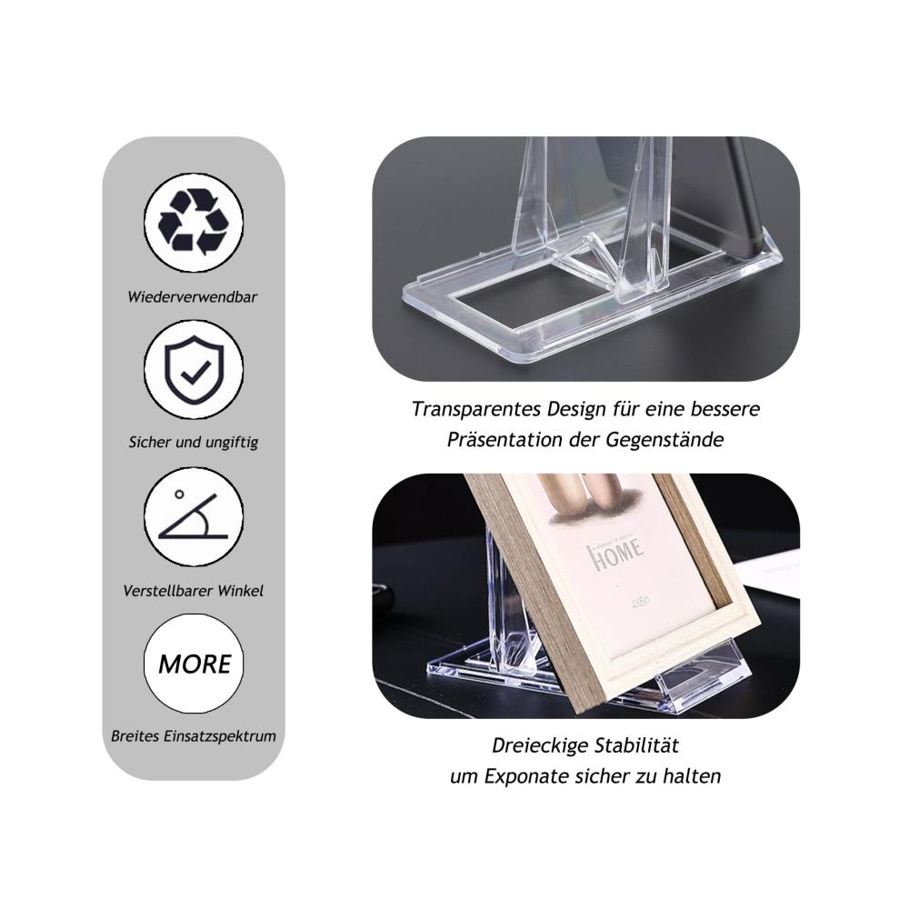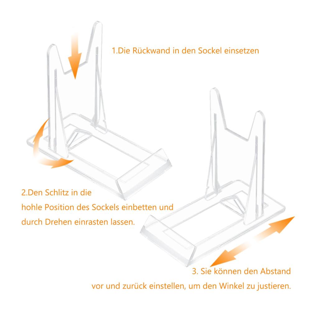 Dank ihres transparenten Designs fügen sich die Ständer nahtlos in Ihren Wohnstil ein und lenken nicht von Ihren Ausstellungsstücken ab. Die hochwertigen Materialien gewährleisten Stabilität und Langlebigkeit, während der einstellbare Winkel eine perfekte Präsentation ermöglicht.