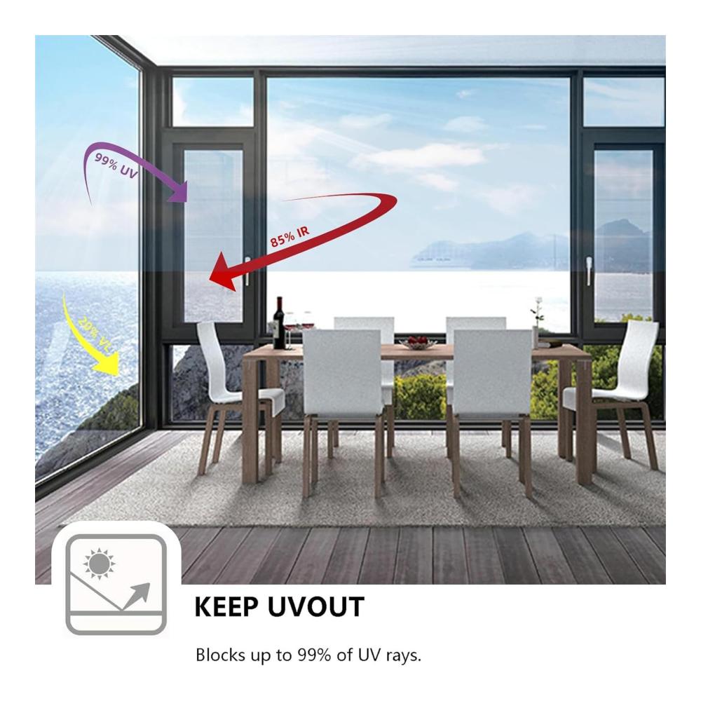- Die klebstofffreie Sonnenschutzfolie bietet tagsüber einen hervorragenden Sichtschutz, mit einem stärkeren Einwegspiegeleffekt, wenn das Außenlicht stärker ist als das Innenlicht.
