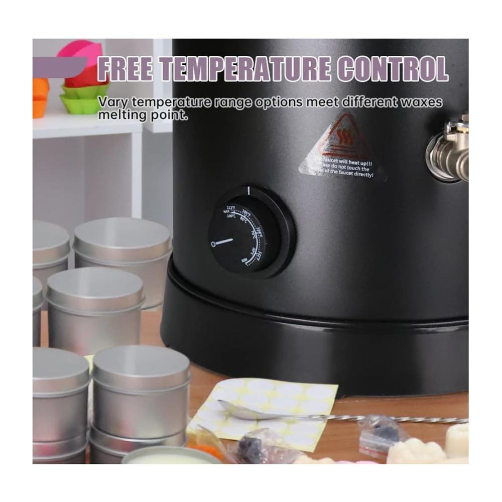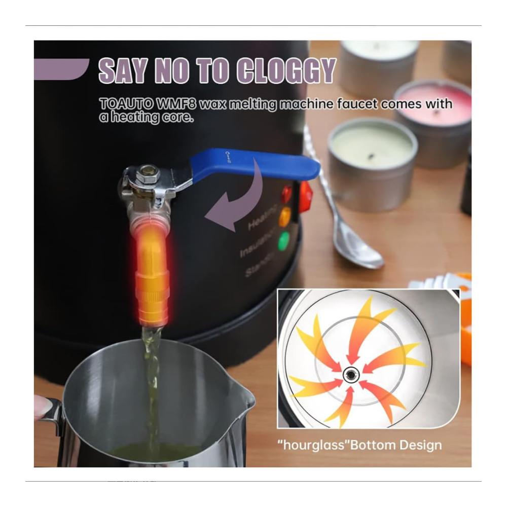 【Effizientes und sauberes Ausgießen】 Mit der innovativen Heizkernauslauftechnologie ermöglicht dieser Wachsschmelzer ein einfaches und schnelles Ausgießen. Die Düse ist tiefer als der Boden des Behälters positioniert und gewährleistet so ein sauberes und gleichmäßiges Ausgießen. Es eignet sich perfekt für Kerzen, Seifenherstellung und Heimwerker-Hobbys und ist die ideale Wahl für kleine bis mittlere Kerzenunternehmen.