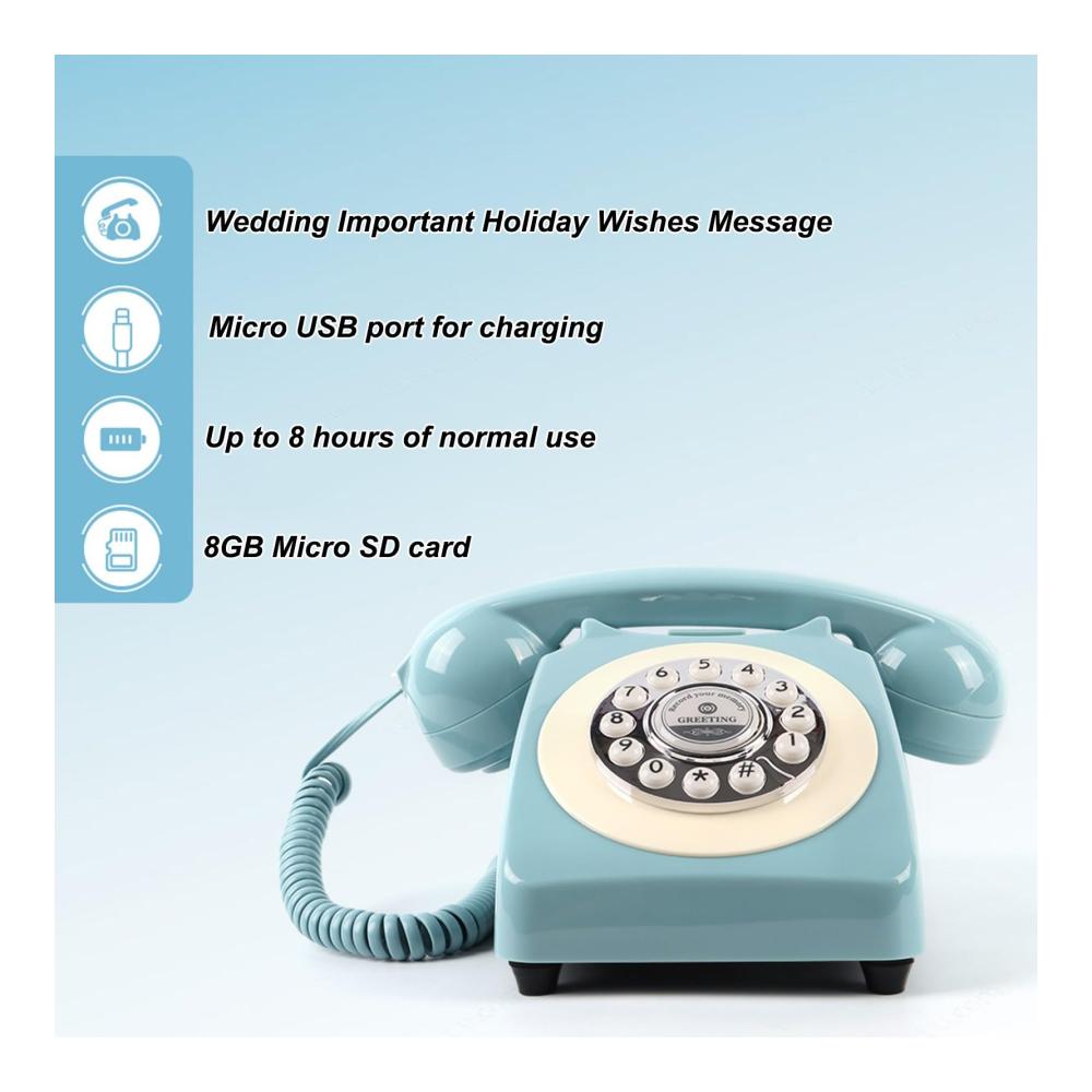 Audio-Nachrichten-Telefon: An wichtigen Tagen wie Hochzeiten, Geburtstagen, Hochzeitstagen usw. kann Audio GuestBook die aufrichtigsten Nachrichten Ihrer Gäste aufzeichnen, und Sie können auch die Stimmen aufzeichnen, die Sie am meisten hören möchten. Diese Nachrichten werden auf der SD-Karte gespeichert. Sie können sie zum Speichern mit Ihrem Telefon oder Computer synchronisieren. Dadurch bleiben die Segnungen lange genug erhalten!