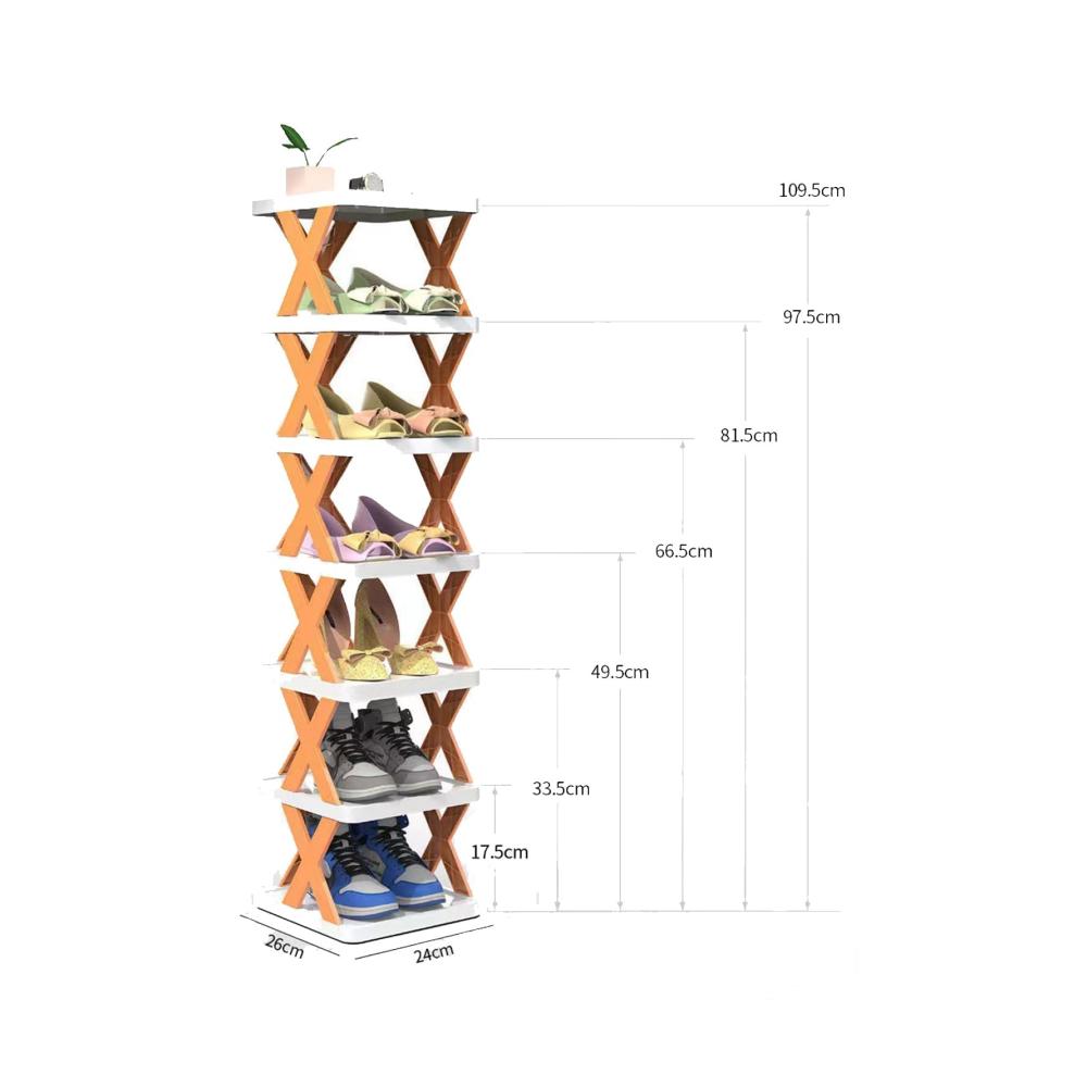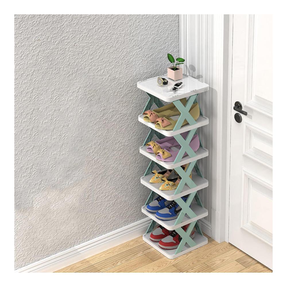 Das zusammenklappbare Schuhregal misst 24 * 26 * 67 cm und ist in verschiedenen Farben erhältlich, darunter Blau, Grün und Orange.