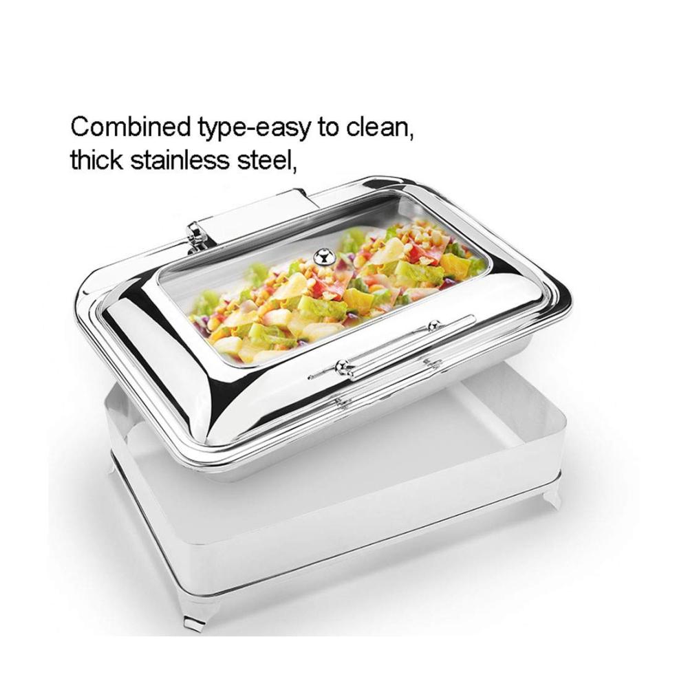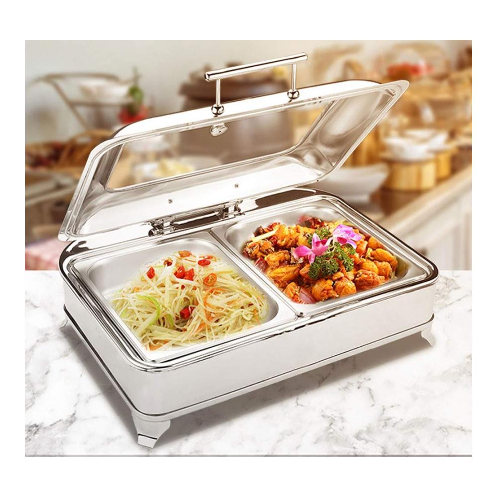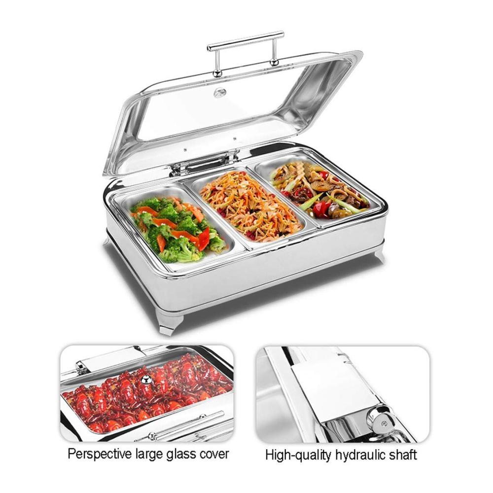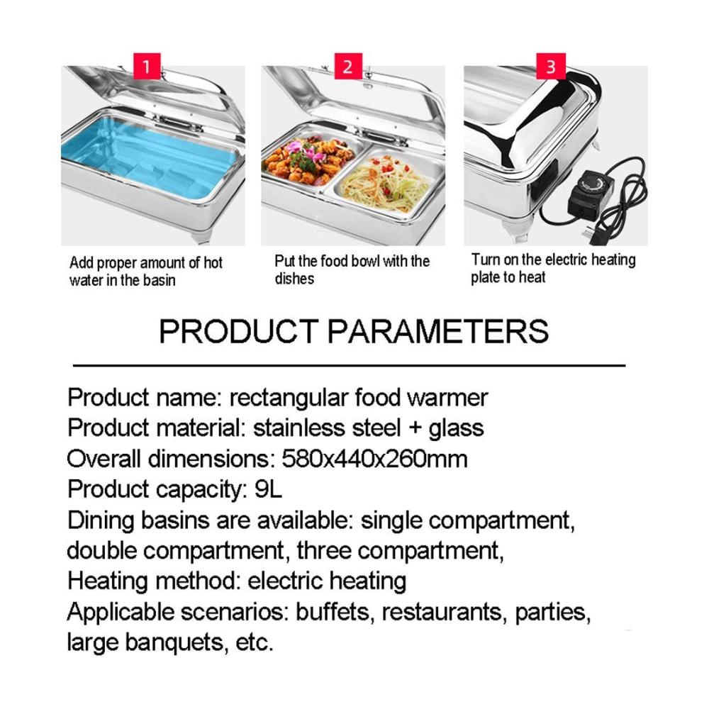 Hält das Essen den ganzen Tag warm – Geben Sie die richtige Menge heißes Wasser in das Becken, legen Sie das Essen in jedes der Tabletts und stellen Sie die Temperatur auf die gewünschte Hitze ein. Dann werden Ihre Gäste das warme Essen lange genießen, häufiges Erhitzen vermeiden und das Originalgeschmack des Essens beeinträchtigen.