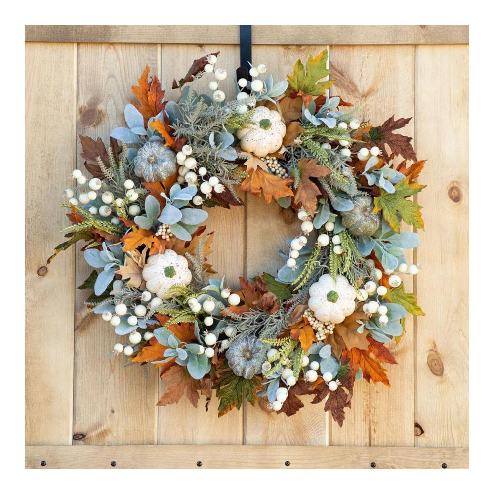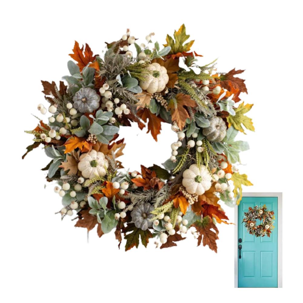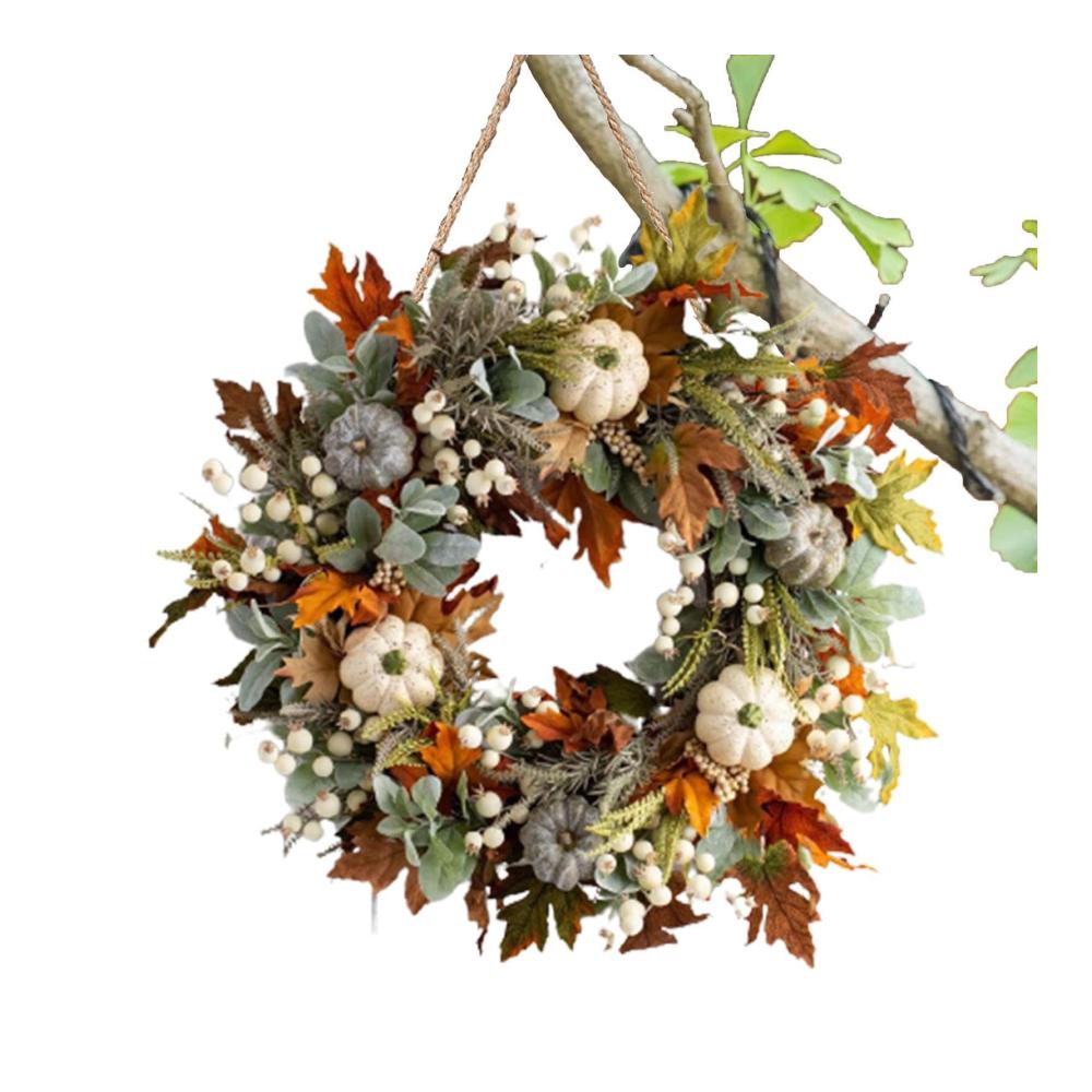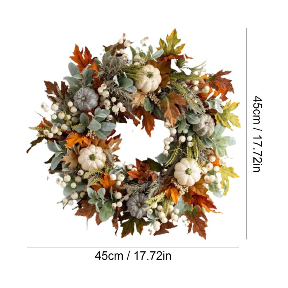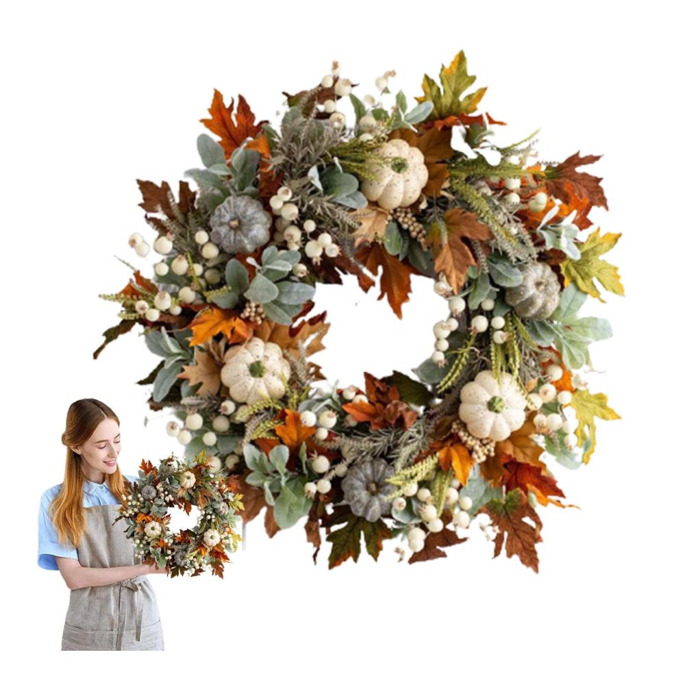 ♆ Einzigartiges Design – Dieser Herbstkranz besticht durch eine faszinierende Kombination aus weißen Kürbissen, Beeren, Ahornblättern und grünen Blättern. Verleihen Sie Ihrem Zuhause mit diesem einzigartigen Thanksgiving-Kranz einen charmanten Akzent.