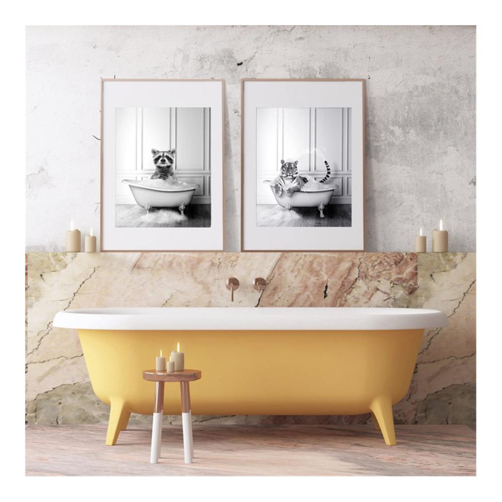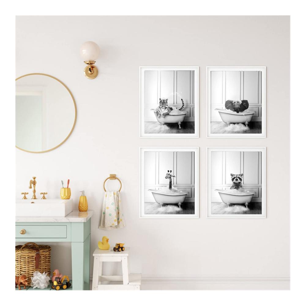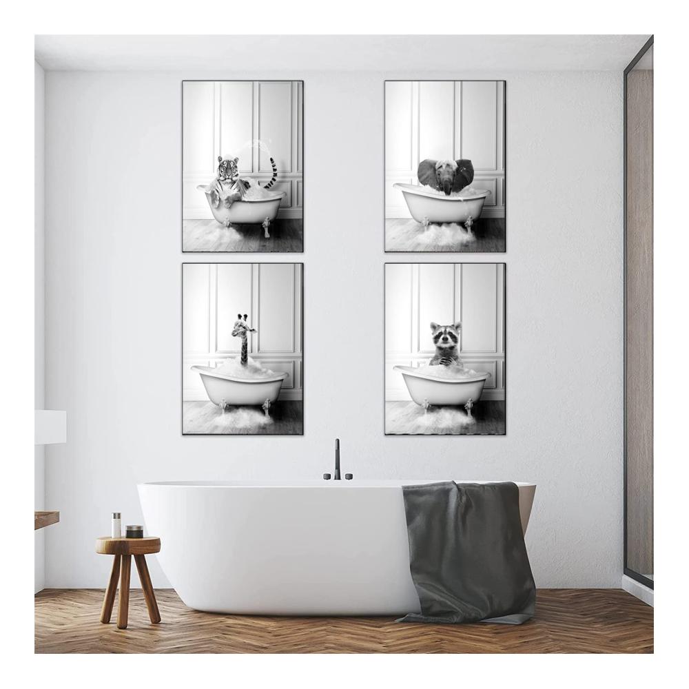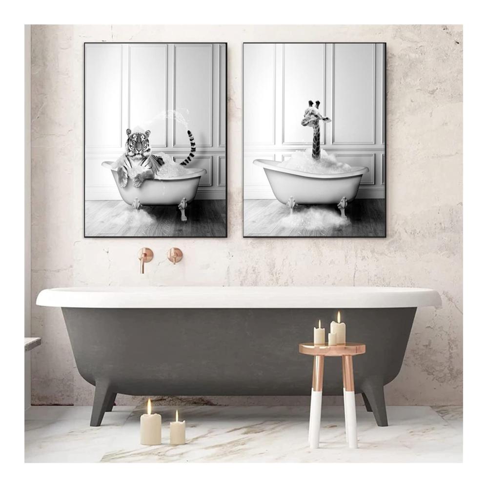 Unser Wandkunst-Set umfasst charmante Szenen, darunter eine Giraffe in der Badewanne, die garantiert ein Lächeln auf Ihr Gesicht zaubert. Jedes Bild ist auf Leinwand gedruckt und sorgt für eine stilvolle Dekoration in Ihrem Badezimmer.