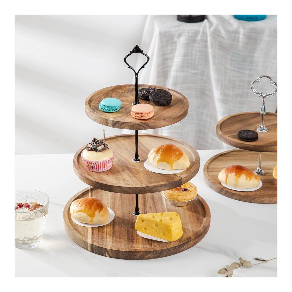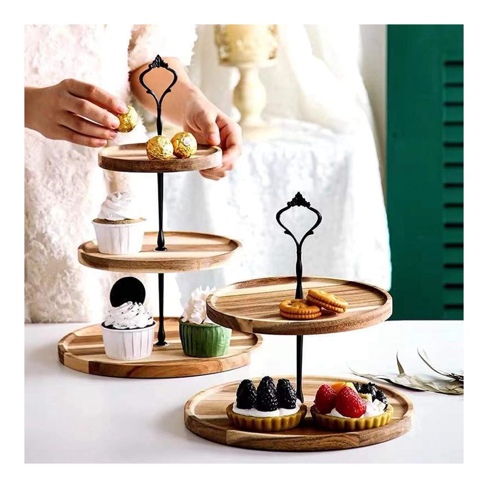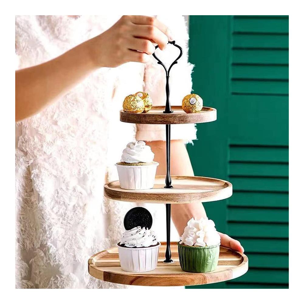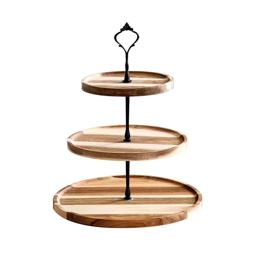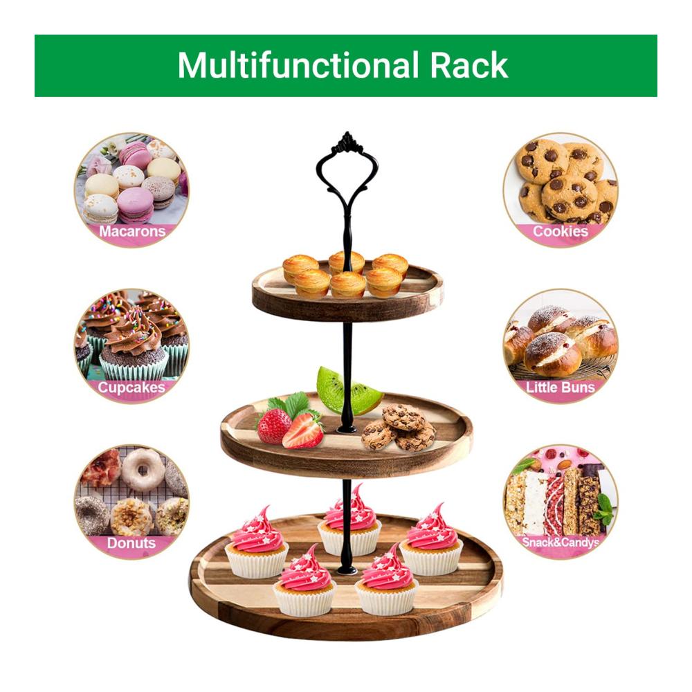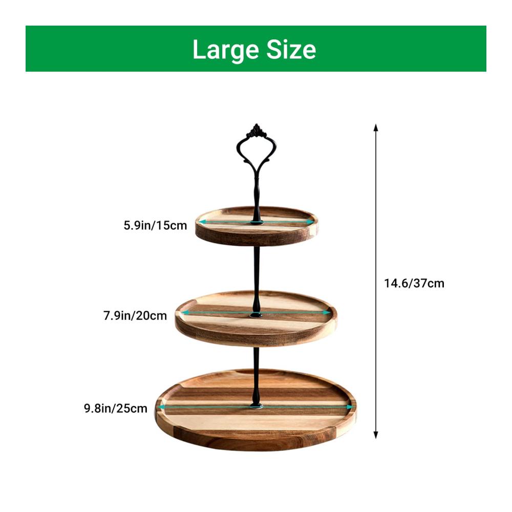 ETAGEREDie dreistöckige Etagere ermöglicht es Ihnen Lebensmittel wie Kuchen, Muffins, Cupcakes, Macarons oder Pralinen auf eine elegante Art und Weise zu präsentieren. Natürlich kann man auf dem Gestell auch herzhafte Sachen wie z.B. Canapés oder Sushi anrichtenEDLEM AKAZIENHOLZDer Kuchenständer besteht aus 100% akazienholz, sicherem und umweltfreundlichem ungiftigem MaterialSERVIERTABLETTDiese Tortenplatte zu einem besonders schönen Objekt auf jedem Kuchenbuffet, da die verschiedenen Höhen das Buffet noch opulenter wirken lassen und der Platz auf dem Tisch optimal genutzt werden kannVIELSEITIG VERWENDBARIdeal für Restaurant und den Hausgebrauch geeignet, zum Servieren von Dessert, Käse, Gebäck, Obst, Muffin, Cupcake, Kuchen, Törtchen uswGröße:Die obere: 15cmDie mittlere: 20cmDie untere Etagere: 25cmGesamthöhe: 37cmLieferumfang:1 x Cupcake Ständer3 x Stabsäulenbaugruppen