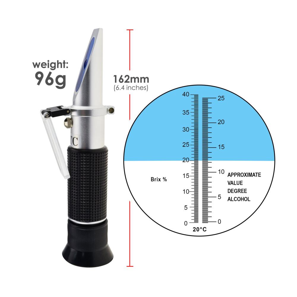 Das Alkohol- und Brix-Refraktometer wurde für die Weinherstellung entwickelt. Zum Testen des Zuckergehalts und der Alkoholkonzentration nach Volumen in Traubensaft.