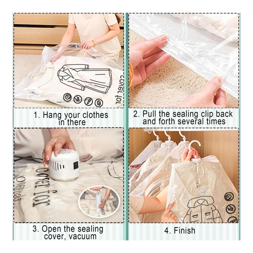 【Einfach zu benutzen】Hängen Sie zunächst die vakuumversiegelten Aufbewahrungsbeutel in den Schrank; Hängen Sie dann Ihre Kleidung in die Beutel und schließen Sie die Beutel; Öffnen Sie dann das Ventil und saugen Sie die Luft mit der Vakuumpumpe (nicht im Lieferumfang enthalten) ab; Schließen Sie schließlich den Ventildeckel, um eine luftdichte Versiegelung zu erzielen; Der Vorgang ist einfach und schnell.