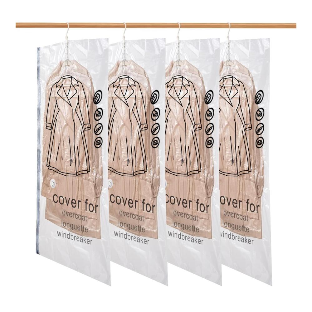 Optimieren Sie Ihren Kleiderschrank mit unseren Vakuum-Platzsparern! Dieses 4er-Pack langer Vakuumbeutel (135x70cm) eignet sich perfekt für Jacken, Mäntel und lange Kleidung. Mit einer Platzersparnis von 80% maximieren Sie Ihre Aufbewahrungsmöglichkeiten. Die Beutel bestehen aus strapazierfähigem PE- und PA-Verbundmaterial, das Ihre Kleidung vor Staub schützt und geruchsfrei hält. Das spezielle Fünf-Ring-Hakendesign ermöglicht eine einfache Auswahl Ihrer Kleidungsstücke. Das luftdichte und auslaufsichere Design mit Turboventil und doppeltem Reißverschluss sorgt für lang anhaltendes Vakuum. Einfach zu verwenden – perfekt
