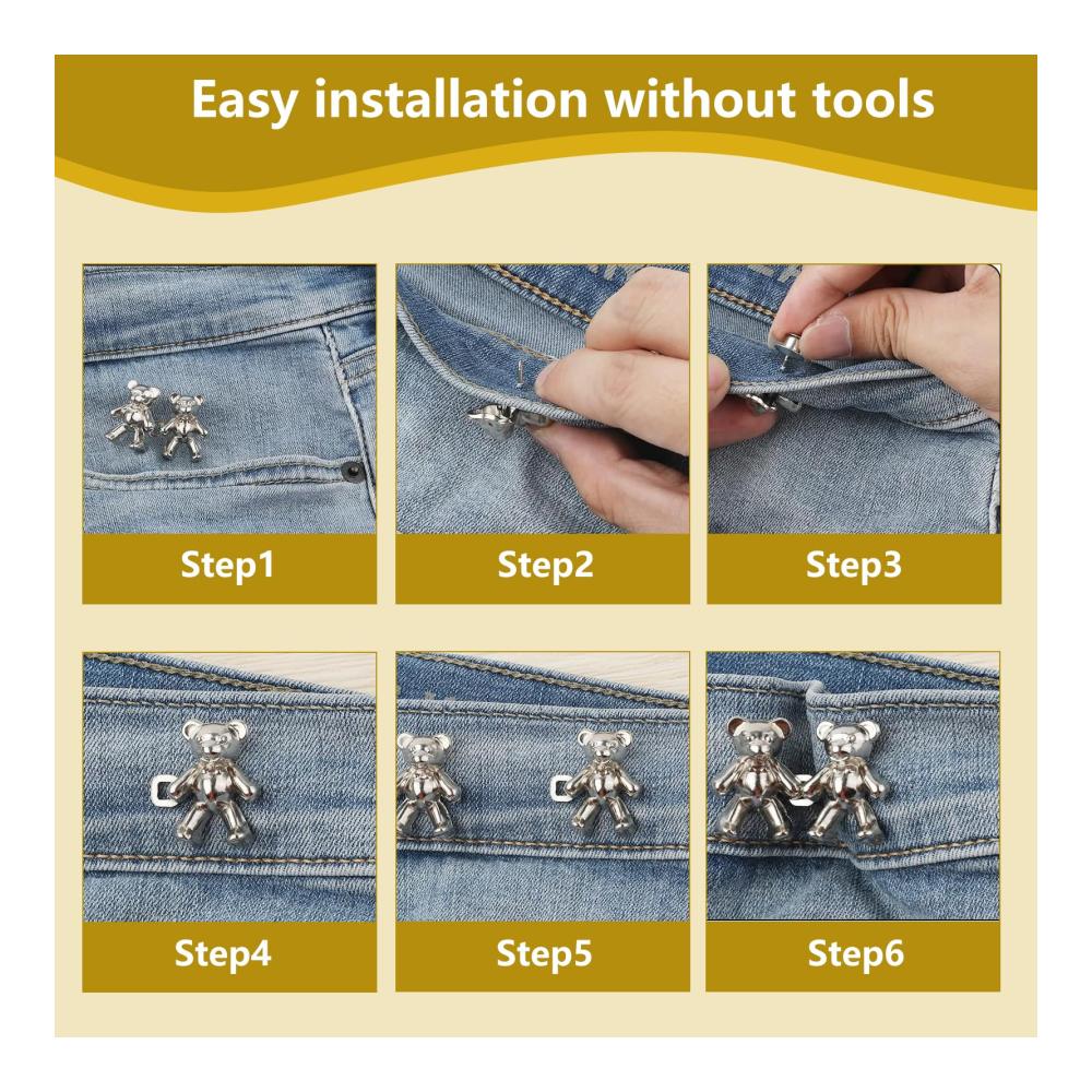 Die Installation ist ein Kinderspiel – kein Nähen, kein Werkzeug erforderlich. Das einzigartige Slot-Design sorgt dafür, dass die Knöpfe fest sitzen, ohne zu verrutschen. Verkleinern Sie mühelos die Taillengröße Ihrer Jeans und verleihen Sie ihnen eine individuelle Note.