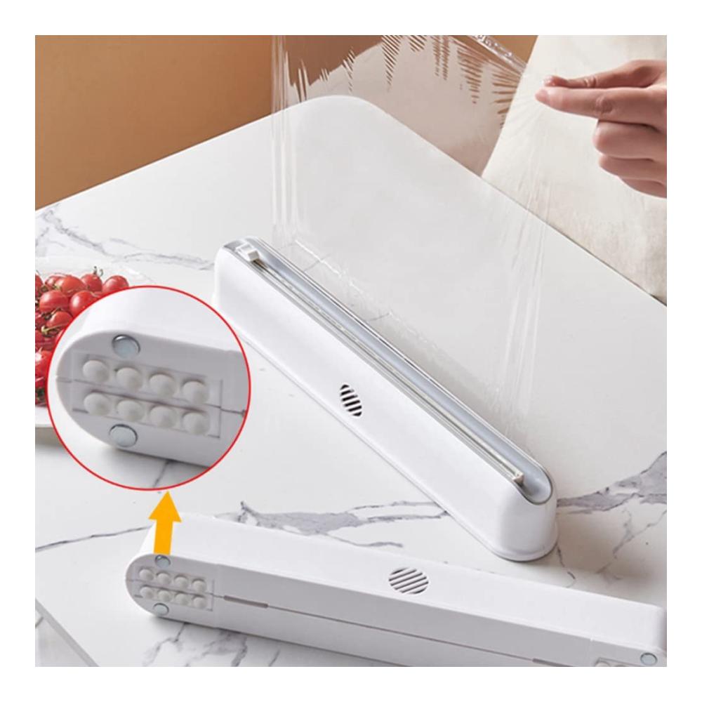 Das neue Design besticht durch Modernität und Schlichtheit. Der bidirektionale Schneidknopf mit Schneidkopf ermöglicht ein müheloses Schneiden von Kunststofffolie. Die Unterseite ist mit 8 Mini-Saugnäpfen ausgestattet, die nicht nur für Stabilität sorgen, sondern auch das Küchendekor verschönern.