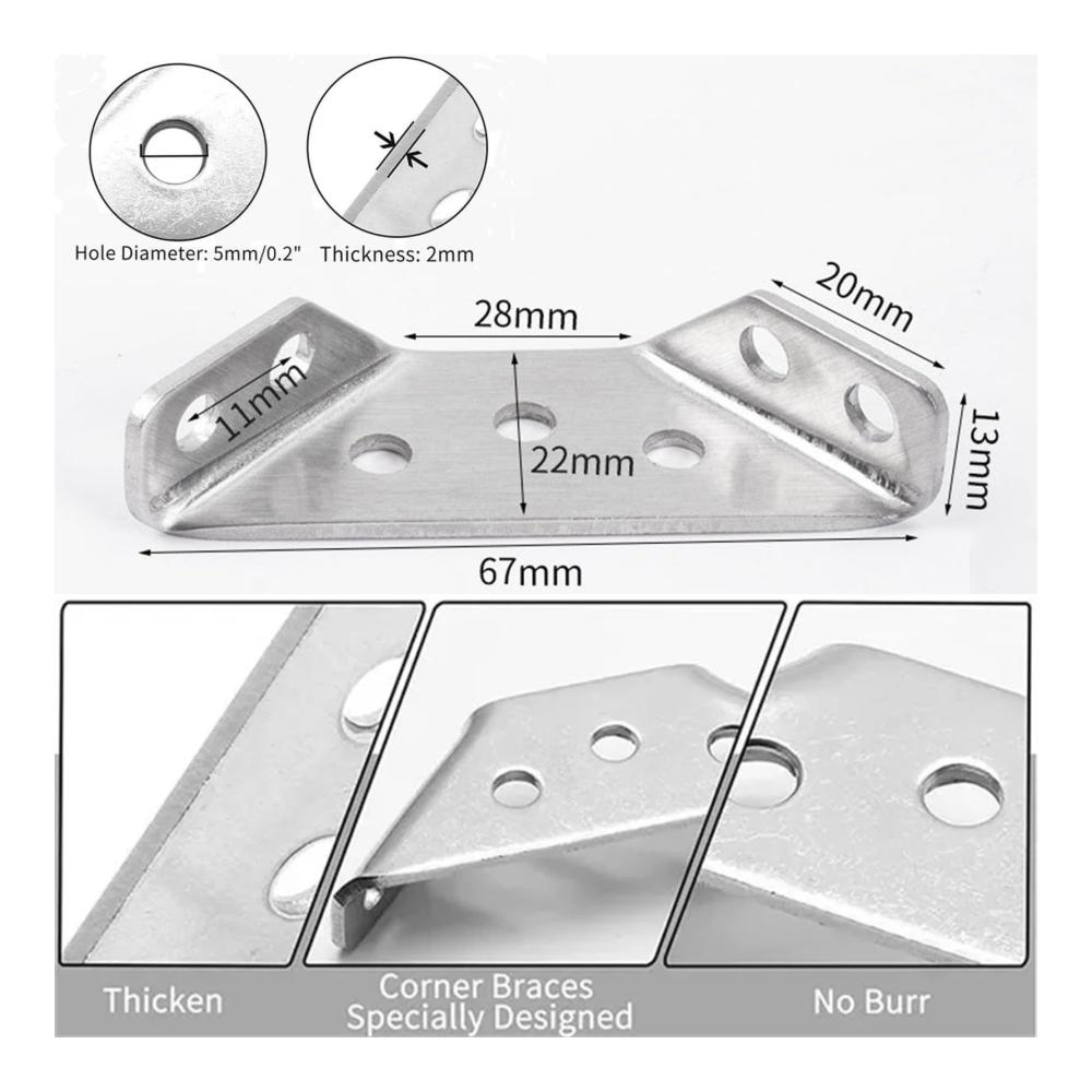 Winkel-Eckwinkel aus Edelstahl für Holz, trapezförmige Eckstrebe, Möbelbefestigung MERKMALE: 1. Diese robuste Eckhalterung hält einer schweren Last stand, ohne sich zu verformen, und kann bedenkenlos verwendet werden. 2. Trapezförmige Eckstreben bestehen aus hochwertigem Edelstahl mit gebürstetem Nickel-Finish, sind robust und langlebig. 3. Einfach zu installieren, passt perfekt zu den meisten Holzmöbeln. 4. Perfekt für feste Stühle, Bücherregale, Fenster, Türen, Tischbeine, Betten, Schränke und Schubladen usw. SPEZIFIKATIONEN: Material: Premium-Edelstahl Eckstrebengröße: 69 x 26 x 30 mm/2,7 x 1 x 1,18 Zoll Lochgröße: 5 mm/0,19 Zoll Durchmesser Farbe: Gebürstetes Silber Packungsinhalt: 10/20/30 Stück Universal-Möbel-Eckverbinder Hinweis: Aufgrund der unterschiedlichen Anzeige- und Lichteffekte kann die tatsächliche Farbe des Artikels geringfügig von der auf dem Bild angezeigten Farbe abweichen. Universeller Möbel-Eckverbinder, trapezförmige Eckstrebe, Winkel-Eckwinkel aus Edelstahl für Holz