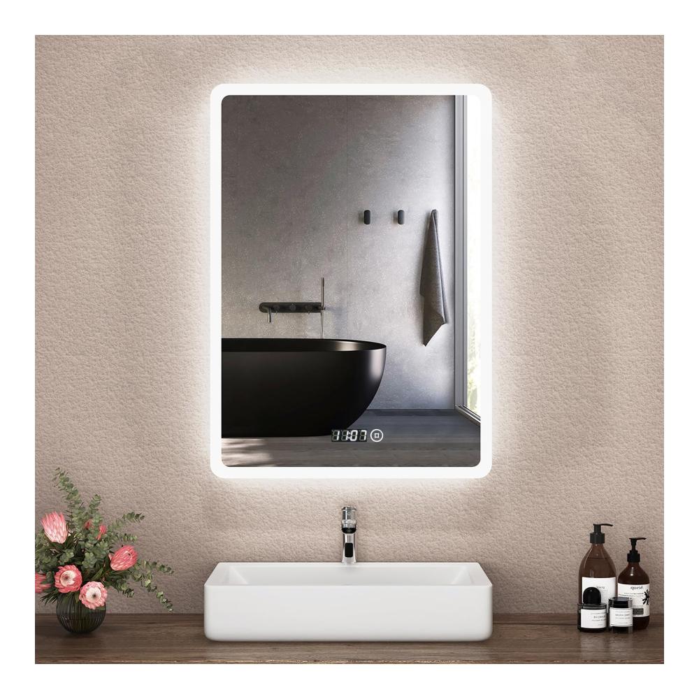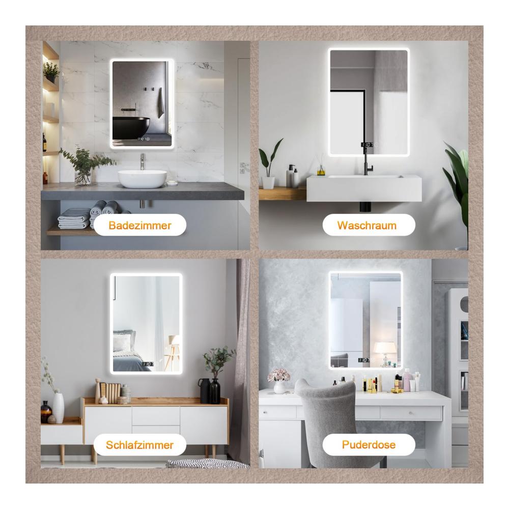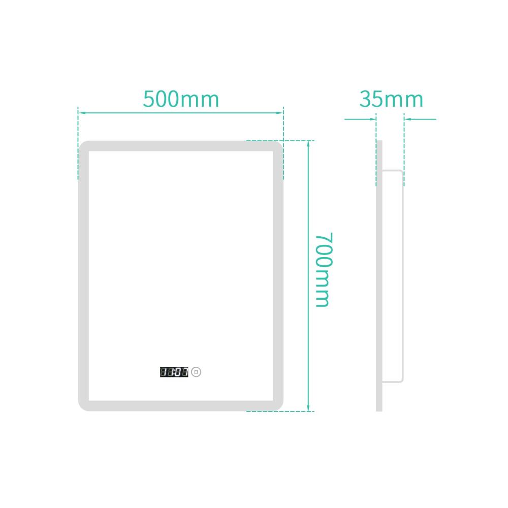 Entdecken Sie unseren modernen LED Wandspiegel mit Uhr in der Größe 50 x 70 cm (BXH). Mit einer schlanken Bauweise von nur 35mm Abstand zur Wand und polierten Kanten fügt er sich perfekt in Ihr Badezimmer ein.
