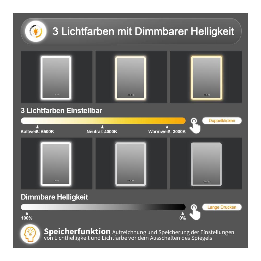 3 Lichtfarben mit dimmbarer helligkeit. Unser LED Badspiegel verfügt über Warmweiß 3000K / Kaltweiß 6500K / Neutral 4000K Beleuchtung, jede Lichtfarbe passt sich individuell Ihren Wünschen an und sorgt für eine helle oder entspannte Atmosphäre, und kann auf unterschiedliche Helligkeiten eingestellt werden.