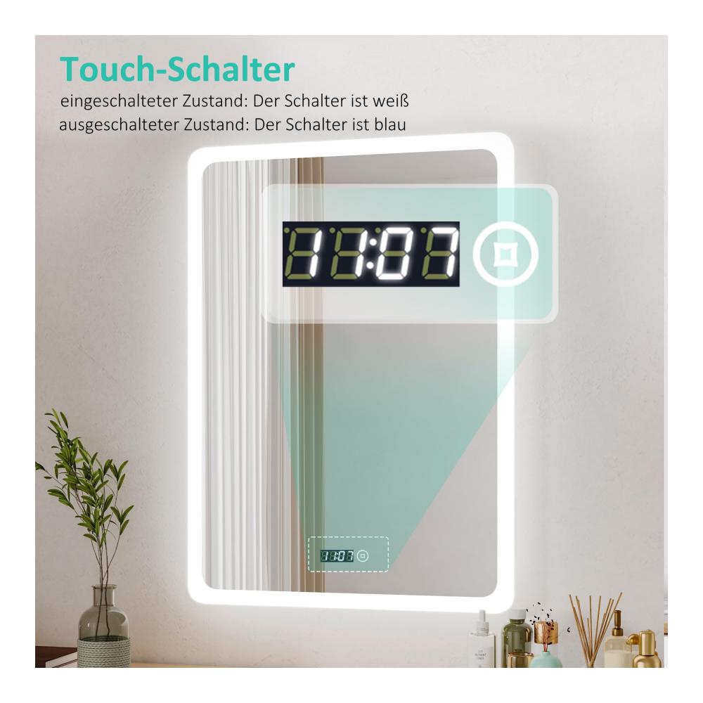 Dank der integrierten Digitaluhr behalten Sie stets die Zeit im Blick. Der praktische Touchschalter ermöglicht ein einfaches Ein- und Ausschalten der Beleuchtung durch Berührung der Glasfläche.