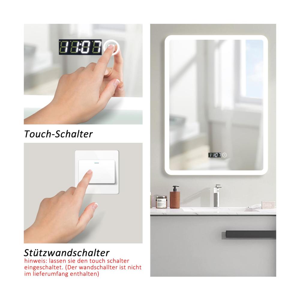 Sie werden nie wieder den Überblick über die Zeit verliehren, da dieser elegante Spiegel über eine Digitaluhr verfügt. Dank der Memory-Funktion des Schalters können Sie den Wandschalter verwenden, um das Licht am Spiegel ein- und auszuschalten.