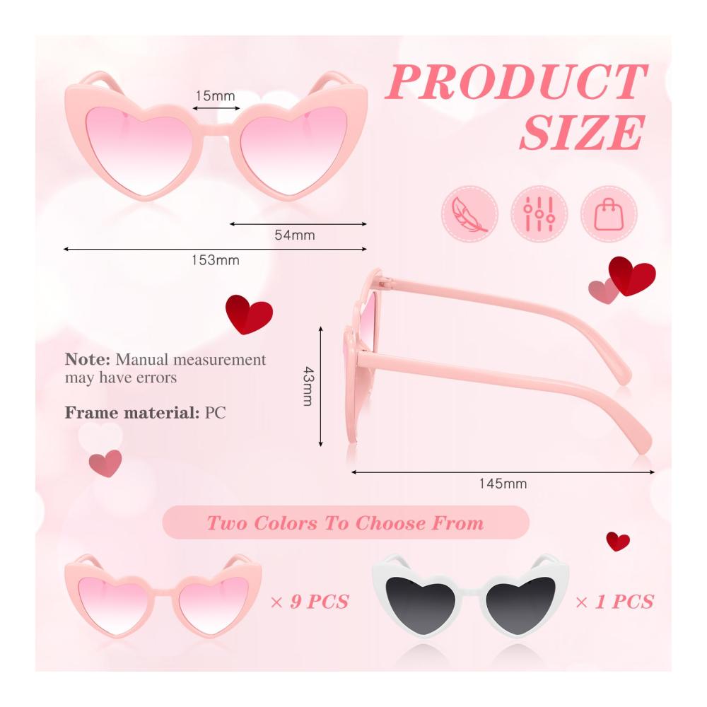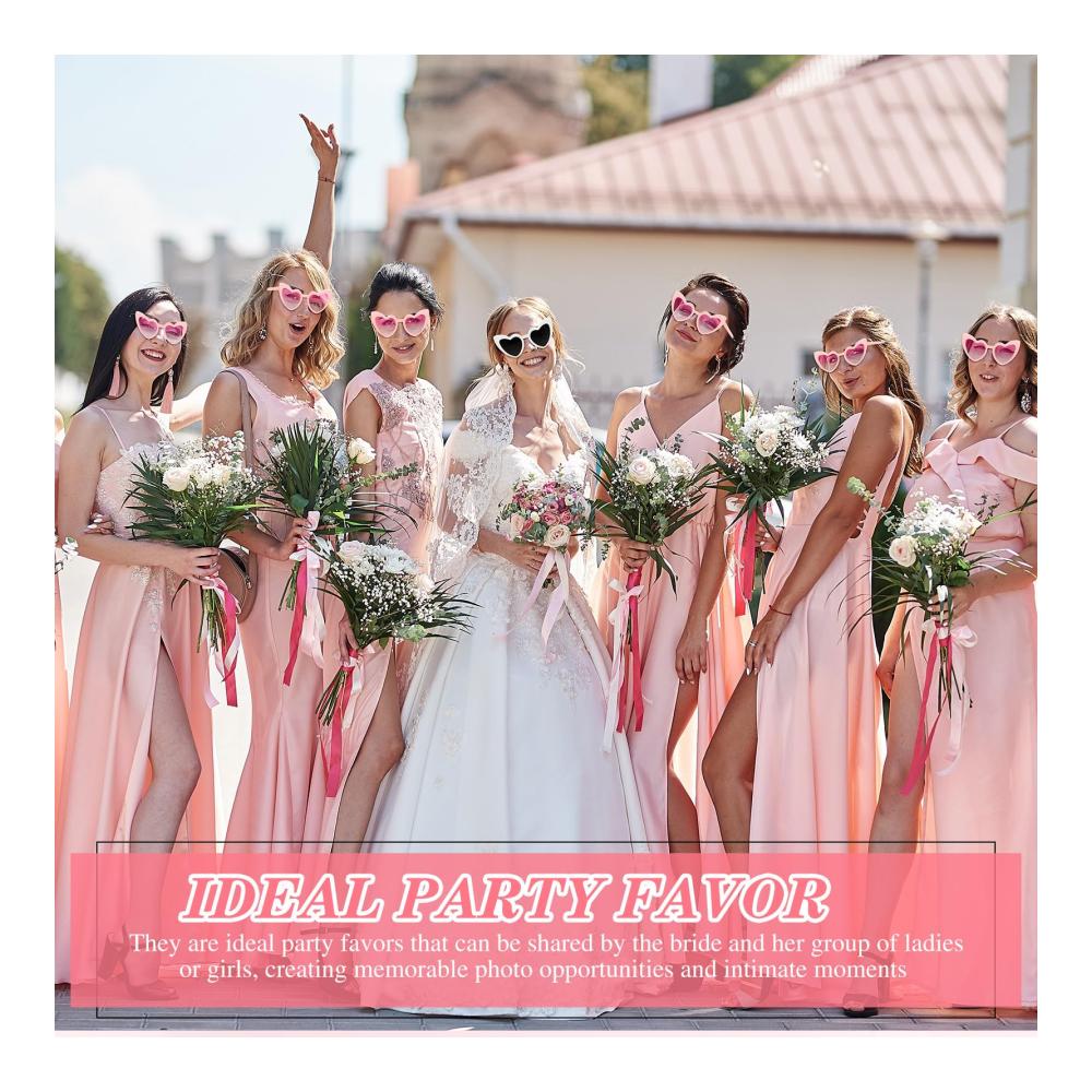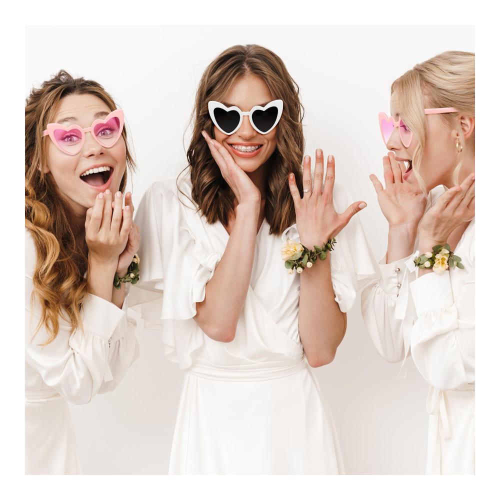 Tauchen Sie ein in den Glamour Ihrer Feier: Photect präsentiert 10 stylische Herz Sonnenbrillen, perfekt für Junggesellinnenabschiede, Hochzeiten und Brautpartys. Dieses ideale Partygeschenk besteht aus 1 weißer und 9 rosa Retro Herzbrillen, die die Braut und ihre Damen verbinden. Das stilvolle herzförmige Design verleiht Ihrem Party-Outfit eine lustige Note. Vielseitig und lustig, diese Brille ist perfekt für besondere Anlässe oder als tägliches Accessoire. Die langlebige Konstruktion aus hochwertigem PC-Glasrahmen und AC-Brillenlinsen sorgt für Festlichkeit ohne Sorgen. Mit angemessener Größe für bequemen Tragekomfort. Erleben Sie unvergessliche Momente mit diesen Brautaccess