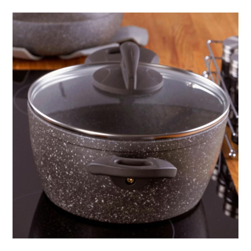 Entdecken Sie die Vielseitigkeit der Küche mit unserer 2,4 Liter Lavastein-Kasserolle in Grau. Hergestellt aus hochwertigem Aluminium, verfügt sie über eine verbesserte Antihaftbeschichtung aus 5 Schichten Lavastein, die sie besonders widerstandsfähig gegen Abrieb und hohe Temperaturen macht. Perfekt zum Braten und Kochen auf verschiedenen Herdarten, einschließlich Induktion. Der Glasdeckel mit Dampfventil beschleunigt das Garen und erhält alle Aromen Ihrer Lieblingsgerichte.