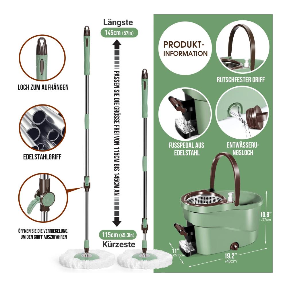Das Wischmopp Set mit Eimer ist die perfekte Lösung für Ihre Bodenreinigungsbedürfnisse zu Hause. Mit einem robusten Edelstahl Teleskopstiel, der sich auf bis zu 145 cm ausdehnen lässt, können Sie mühelos auch schwer erreichbare Stellen reinigen. Das Fußpedal erleichtert das Auswringen des Wischmopps, während der mitgelieferte Eimer eine praktische Aufbewahrungsmöglichkeit bietet.