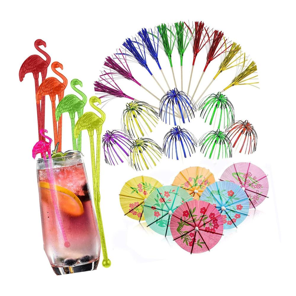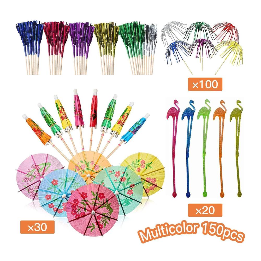 150 Stück Regenschirme Cocktail Set Party Zubehör Dekorationen, Cocktail Zubehör Regenschirme, Feuerwerk Zahnstocher und Flamingo Rührstäbchen Cocktail
