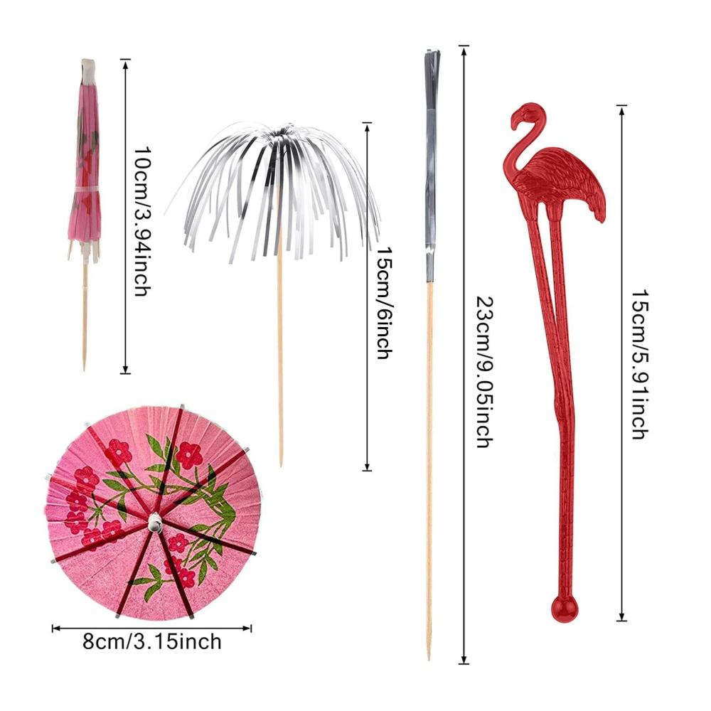 【Cocktail Set】 Es gibt 150 Stücke Cocktail Dekorationen, darunter 30 Stücke Papierschirmstangen, 20 Stücke Flamingo Cocktailrührer, 100 Stücke Folienfeuerwerk.