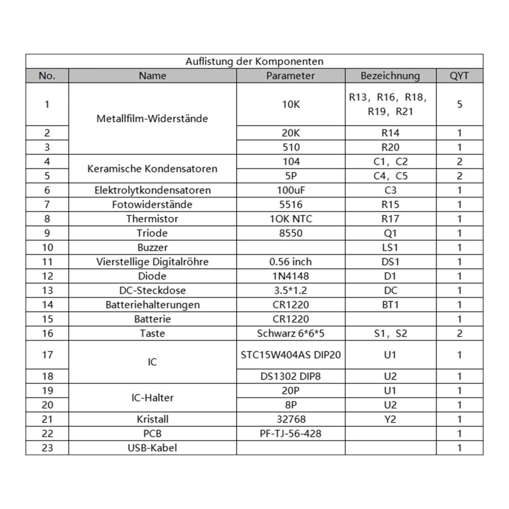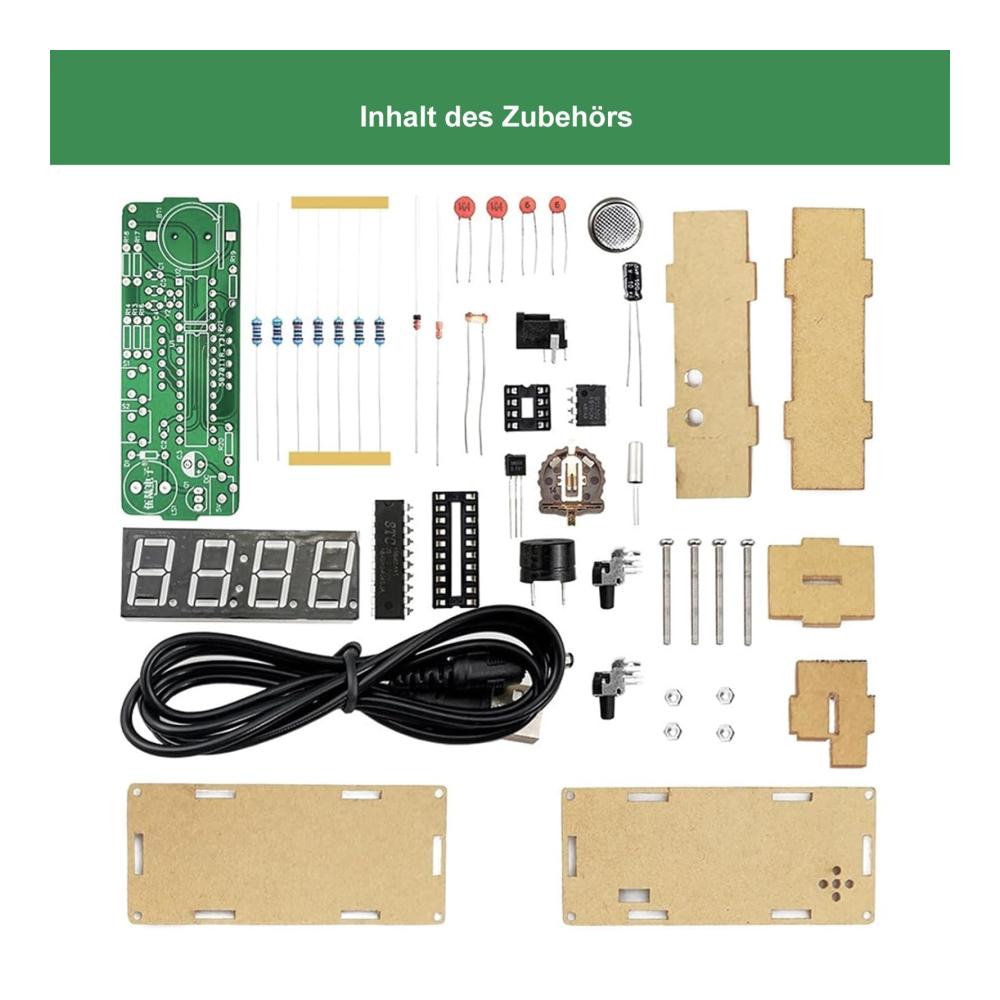 Entdecken Sie mit unserem Sets Elektronischen Uhren Löten Bausatz 4 Bit Digital Röhre Uhr DIY Kit eine Welt voller Möglichkeiten. Diese multifunktionale Uhr zeigt nicht nur Stunden, Minuten und Sekunden an, sondern auch Jahr, Monat, Tag und Temperatur. Sie verfügt über Musikalarm, Erinnerung an die volle Stunde und Helligkeitsregelung. Die kompakte Größe macht sie perfekt für unterwegs. Mit klaren Markierungen und Diagrammen ist sie einfach zu installieren und perfekt für Lötübungen geeignet. Dieses praktische Lernpaket hilft Ihnen, elektronische Fertigungstechniken zu beherrschen und grundlegende elektronische Fähigkeiten zu erlernen. Perfekt für Schule, Wissenschaftswettbewerbe und Familienbildung.