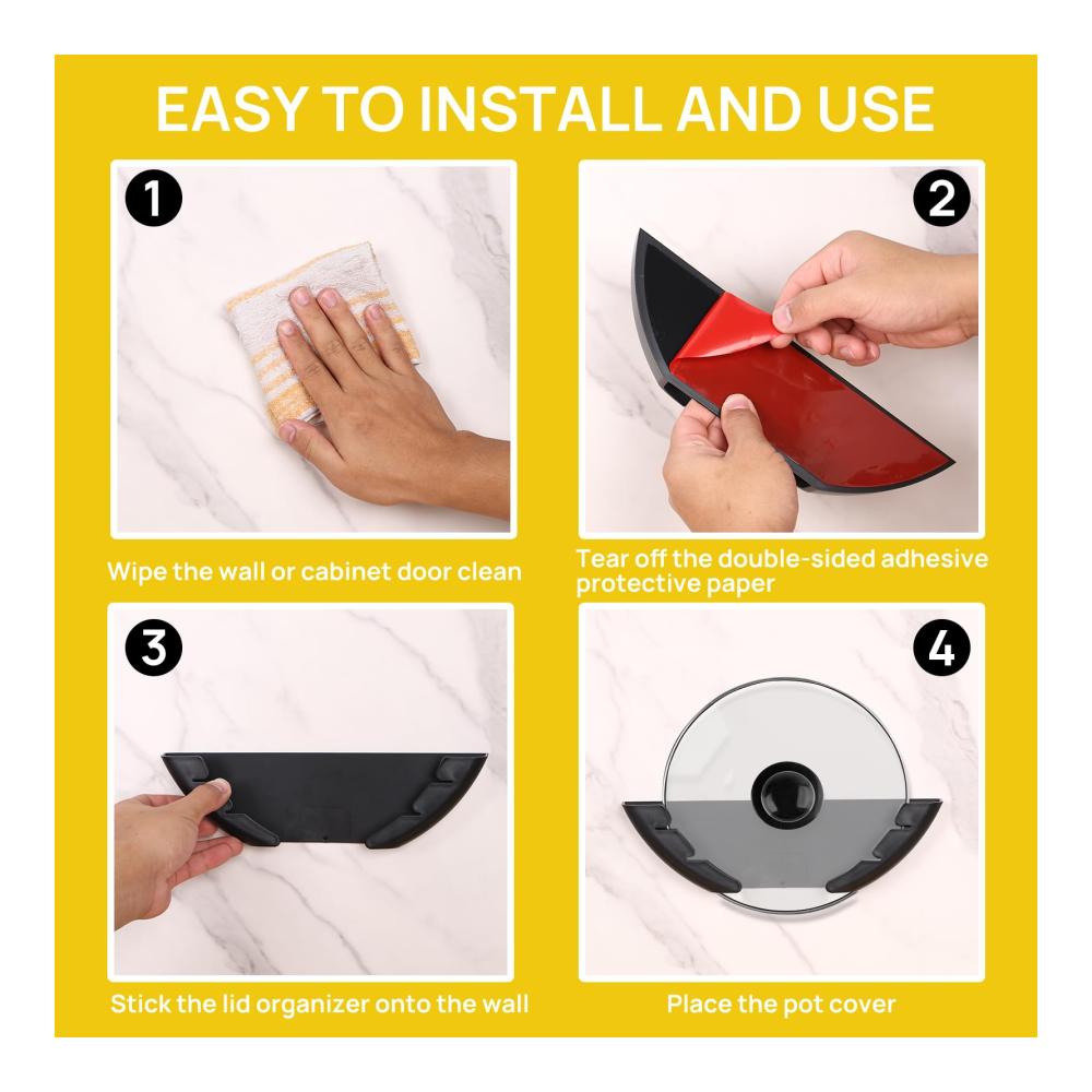 1. Auf der Rückseite jedes Topfdeckelhalters befindet sich starkes doppelseitiges Klebeband. Sie müssen nur das Schutzpapier des doppelseitigen Klebebands abreißen, um es zu installieren. Es ermöglicht eine schnelle und einfache Installation an der Innenseite der Schranktür oder an der Wand . Die Wand oder Schranktür muss vor dem Einkleben abgewischt werden.