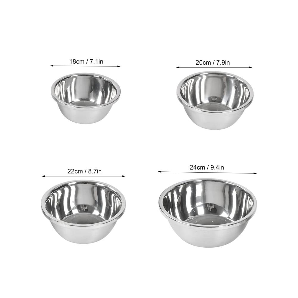 Praktisch: Diese Rührschüssel besteht aus hochwertigem Edelstahlmaterial, sodass Sie sie bedenkenlos verwenden können. Das Rührschüsselset aus Metall ist langlebig, leicht und hat ein modernes Aussehen.Einfach zu verwenden: Abgerundete Seiten sind leicht zu greifen und verletzen Ihre Hände nicht, und der flache Boden ist stabil und erleichtert das Mischen, was Ihren verschiedenen Anforderungen gerecht wird. Mit einer angemessenen Tiefe erlauben diese Rührschüsseln kleine Spritzer beim Mixen oder Mischen.Platz sparen: Rührschüsseln aus Edelstahl können ineinander geschachtelt werden. Das platzsparende, stapelbare Design sorgt für Ordnung in den Küchenschränken und kann Ihren Raum attraktiver gestalten, um Ihren unterschiedlichen Bedürfnissen gerecht zu werden.Edelstahlmaterial: Das Rührschüsselset besteht aus hochwertigem Edelstahl, der stabil, wiederverwendbar und langlebig ist und lange verwendet werden kann. Die breite und flache Seite sorgt für einen stabilen Halt beim Ausgießen, Mischen, Zubereiten von Mahlzeiten und Servieren.Breite Anwendung: Das Rührschüsselset aus Metall kann im Kühlschrank und in der Spülmaschine für eine schnelle und einfache Zubereitung und Reinigung von Mahlzeiten verwendet werden und eignet sich auch hervorragend als Geschenk für Freunde und Familie.Spezifikation: Artikeltyp: RührschüsselMaterial: Edelstahl 304 Farbe silber Set: 4 Stück/SetProduktgröße: ca. 18 cm/7,1 Zoll, 20 cm/7,9 Zoll, 22 cm/8,7 Zoll, 24 cm/9,4 ZollGewicht ca. 900g/31,7oz Paketliste: 4 x Rührschüssel