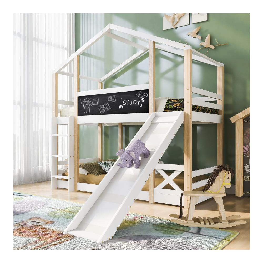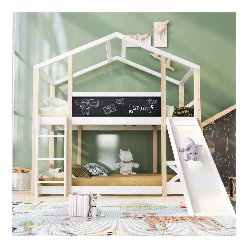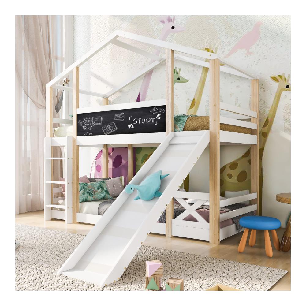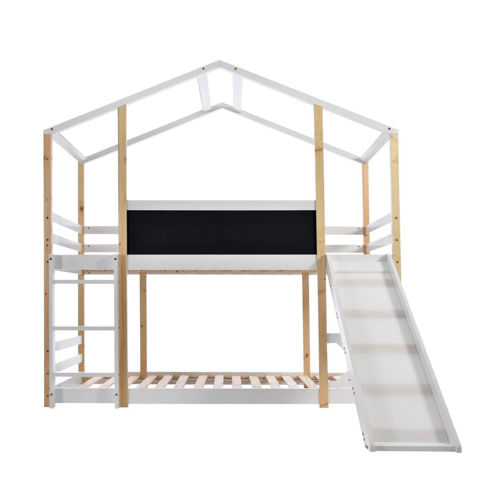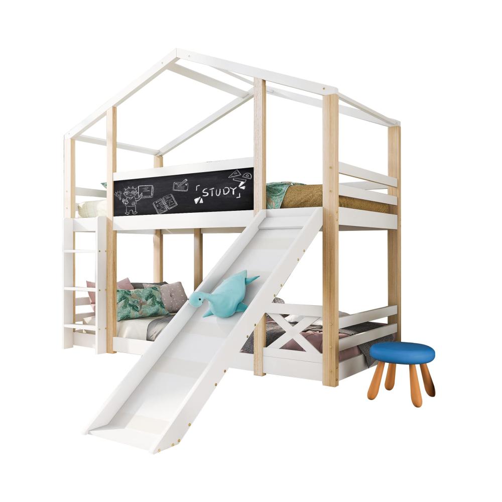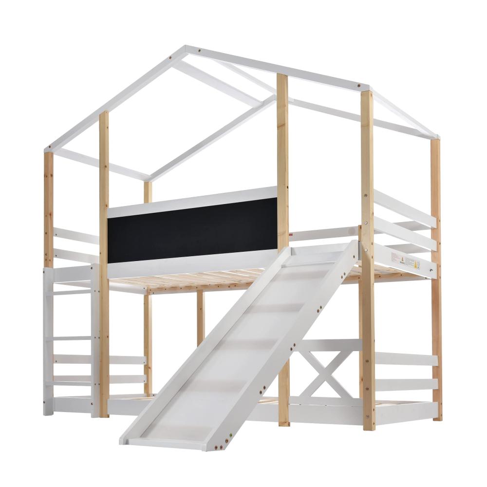 Praktikabilität und Kreativität kombinieren:Das Bett hat eine allgemeine Dachform,die den Bewegungsraum erweitert.Die Vorderseite ist mit einer 110*27cm großen Tafel ausgestattet und macht es zu einem kostengünstigen Bett,das Unterhaltungs- und Schlaffunktion vereint. Dieses Etagenbett bietet zwei Kindern einen eigenen Bereich, so dass mehr Platz zum Spielen oder Lernen zur Verfügung steht.