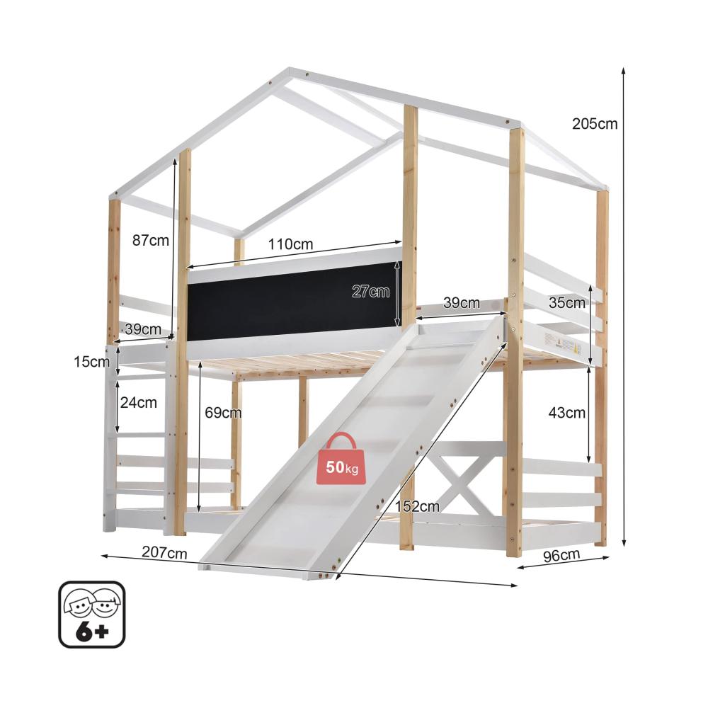Entdecken Sie das ultimative Bettenabenteuer mit unserem Kinderbett Baumhaus! Dieses praktische Hochbett für Kinder vereint Schlaf- und Spielbereich auf clevere Weise. Mit einer großzügigen Rutsche und Leiter ausgestattet, bietet es Ihren Kleinen stundenlangen Spaß und gleichzeitig eine sichere Schlafumgebung. Unser Bett entspricht den höchsten Sicherheitsstandards gemäß EN 747-1:2012 A1:2015 und ist aus hochwertigem Kiefernholz gefertigt. Die mitgelieferten Lattenroste sind FSC-zertifiziert und können bis zu 120 kg tragen. Für zusätzliche Sicherheit verfügt das Bett über einen umlaufenden Herausfallschutz und eine stabile Leiter. Dieses Bett wird in 3 Kartons geliefert, um das Beschädigungsrisiko zu minimieren. Bitte beachten Sie die Gewichtskapazitäten des Bettes und der Rutsche für ein optimales Nutzungserlebnis.