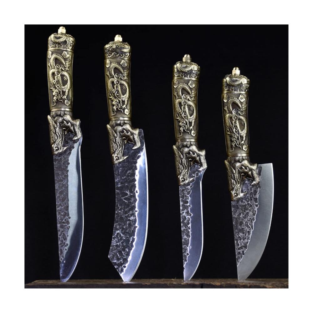 Entdecken Sie das ultimative Küchenmesserset für höchste Leistung: Unsere handgefertigten Wikingermesser aus hochwertigem Kohlenstoffstahl sind scharf, langlebig und luxuriös. Das Kupferdrachen-Dekor verleiht jedem Messer einen einzigartigen Charme.