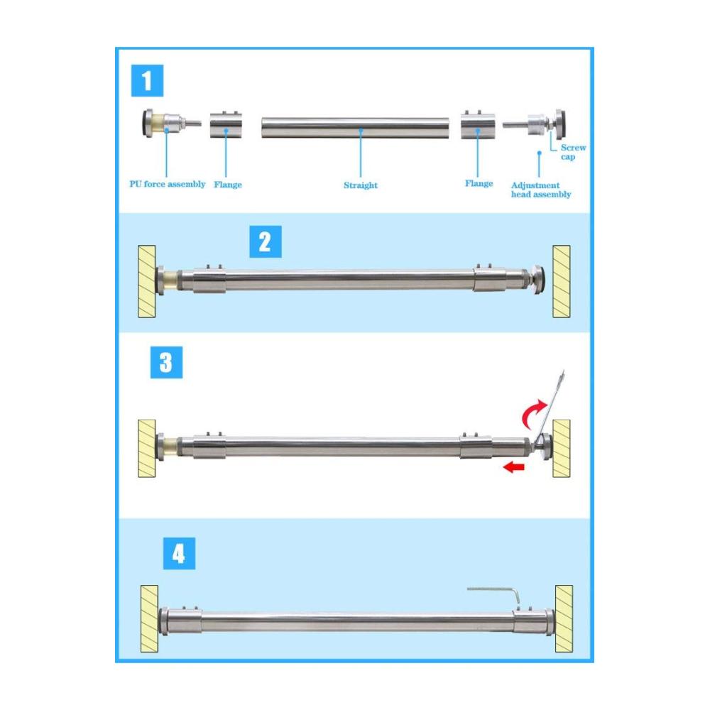 Name: Druckduschvorhangstange mit Rindersehne Material: Edelstahl 304 Spezifikation: Nicht dehnbare gerade Stange Farbe: Edelstahl Durchmesser: 25 mm Wandstärke: 1 mm Merkmale: Druckbeaufschlagung der Rindersehnen, stanzfrei, Material aus Edelstahl 304, einfach an der Wand zu installieren, kann jederzeit beliebig entnommen werden