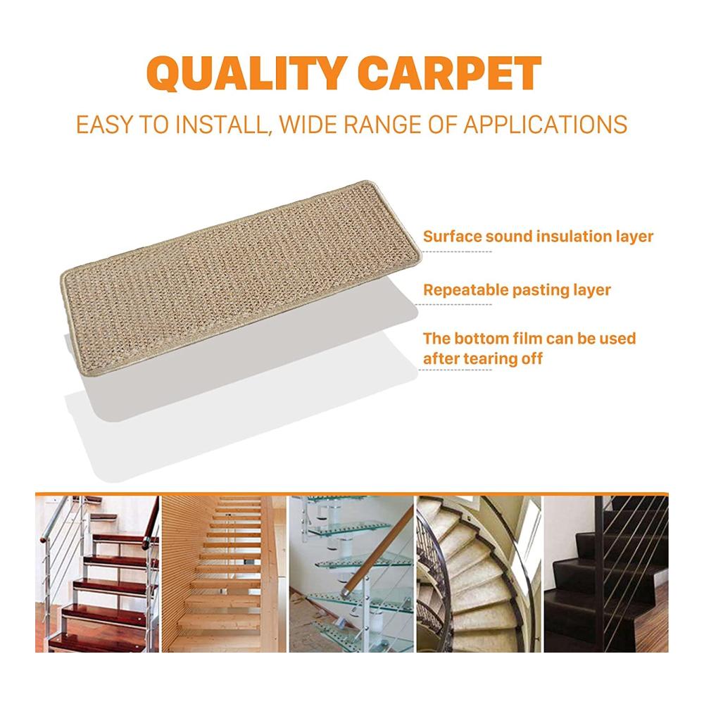 Starke Konstruktion und weiche Treppenabdeckungen sind die beste Lösung, um Rutsch- und Sturzsituationen auf Treppen zu vermeiden!▶Eigenschaften: 1.Sorgt für ein weiches, gepolstertes Gefühl an Ihren Füßen! 2. Mit verbessertem Anti-Rutsch-Material auf der Rückseite der Treppenstufe, bietet hervorragenden Halt und Traktion, um zu verhindern, dass kleine Kinder, Babys, Älteste und Hunde auf Stufen ausrutschen und sicher sind. dauerhafte Lösung zum Schutz von Holzoberflächen vor Kratzern, Dellen, Dellen und Beschädigungen br/>▶Spezifikationen: Produktname: Indoor Outdoor Treppenteppich Material: Polypropylen Eigenschaften: Kufe, selbstklebend, Sisal-Optik, Chemiefaser mit hoher Dichte, Weich, sorgt für Traktion, schmutzabweisend, schimmelresistent, lichtbeständig Verwendung: Hervorragend geeignet für Restaurants, Familienzimmer, Korridore, Hallen, Spielzimmer, Kinderzimmer und mehr! Größe: 25,6 x 9,5 x 0,5 cm. 4 Zoll/65x 24×1 cm(LxBxH) Reinigung: Maschinenwäsche, Handwäsche, Staubsaugen, *BITTE BEACHTEN*: Unsere Rückseite ist nicht geklebt oder dauerhaft haftend wie doppelseitiges Klebeband. Beim Berühren des Klebers mit den Händen ist keine Klebrigkeit zu spüren, aber auf der Treppe haftet er. Nicht der Sonne ausgesetzt. Beim Wiederanbringen nicht stark reißen, um ein Ziehen und Beschädigen des Bodens zu vermeiden br/> Nachwartung ist sehr wichtig!