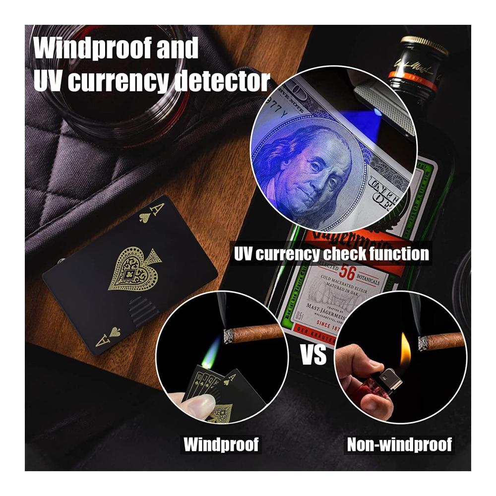 【Winddicht】: Starkes Jetflammen-Butangasfeuerzeug, winddicht. Das Jet-Taschenfeuerzeug eignet sich für Anlässe wie Küche, Campingausflug, Strandgrill, Parks, Sockenfüller usw.