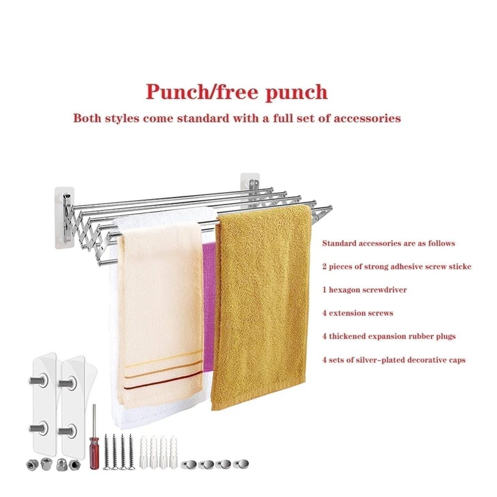 Beschreibung:Das ausziehbare, an der Wand montierte Akkordeon-Design macht diesen zusammenklappbaren Wäscheständer für Kleidung sehr platzsparend und eignet sich sehr gut für kleine Waschküchen, Balkone und Gemeinschaftsbereiche.Wenn Sie Ihre Kleidung trocknen müssen, klappen Sie einfach den Kleiderbügel auf.Schieben Sie es zurück, wenn Sie es nicht verwenden.Produktname: Teleskop-Handtuchhalter/Wäscheständer aus Edelstahl, faltbarProduktfarbe: SilberProduktlänge: 42–80 cmProduktbreite: 35 cm ausdehnen und 12 cm schrumpfenProdukthöhe: 14,5 cmRohstoffmaterial: Edelstahl 304?Einstellbare Länge und platzsparendDurch das Teleskopdesign kann die Länge beliebig zwischen 17 und 32 Zoll eingestellt werden und kann in jedem Raum installiert werden.Die einziehbare Größe der Basis beträgt etwa 14 Zoll und die eingefahrene Größe beträgt etwa 5 Zoll.Das einziehbare Design des faltbaren Wäscheständers für Kleidung ermöglicht es Ihnen, fast jeden Ort mit begrenztem Platz zu reparieren, wie z. B. Waschküchen, Schlafzimmer, Badezimmer und Schwimmbäder.Es eignet sich auch gut für die Verwendung im Freien. Lassen Sie Ihre Kleidung oder Handtücher schnell trocknen.?Die Installation ist super einfachWir stellen Schrauben und Zierkappen zur Verfügung, und Sie können für die Montage auch auf herkömmliche Weise Löcher bohren.?Hergestellt aus EdelstahlDie Teleskopbasis und 6 verdickte Stangen bestehen aus Edelstahl.Die obere und untere Etage bieten Ihnen mehr Platz zur Nutzung.Es kann bis zu 60 Pfund tragen.Die ausgelegte Belastbarkeit beträgt mehr als das Doppelte des Tagesbedarfs, sodass Sie sich um nichts kümmern müssen.Legen Sie alle nassen Handtücher und nassen Kleidungsstücke zum Trocknen auf diesen Kleiderbügel, egal wie schwer oder schwer.?Stabile TeleskopbasisRobuster Edelstahl, dicke Edelstahlstange, robust und langlebig?NietstrukturFällt nach längerem Gebrauch nicht ab.?Viel ZubehörStellen Sie