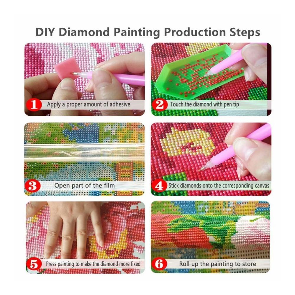 Product Details: Product name: 5D DIY diamond painting Diamond material: resin Diamond type: round Full drill: yes Canvas size: 30*40 inches Kit includes: canvas, diamond, small transparent bag, glue, pen, tray. DIY Steps: 1. Place the corresponding colored diamonds in a plastic tray. 2. Gently shake the tray to secure them together. 3. Peel off the clay protective film, then press the pen’s end into the clay and place the diamond on the sticky pen. 4. Attach diamonds to corresponding numbers and letters. Package includes: Package Content You will receive a complete set of diamond painting kits, including high-definition canvas, pointed drill pen, drill glue, cube diamond tray, colored diamonds