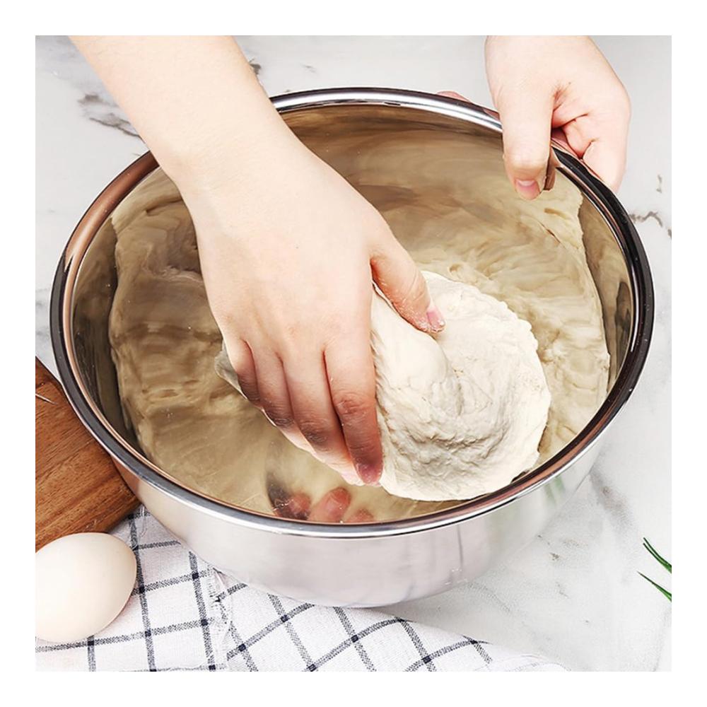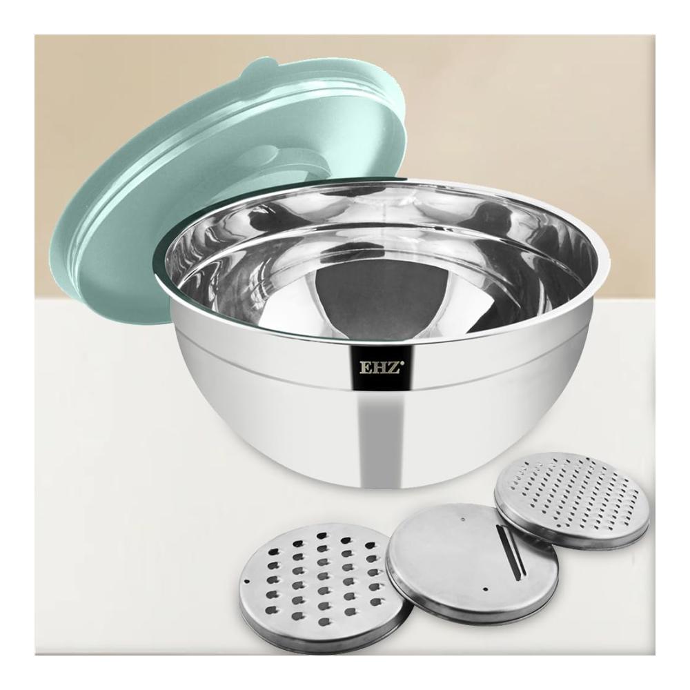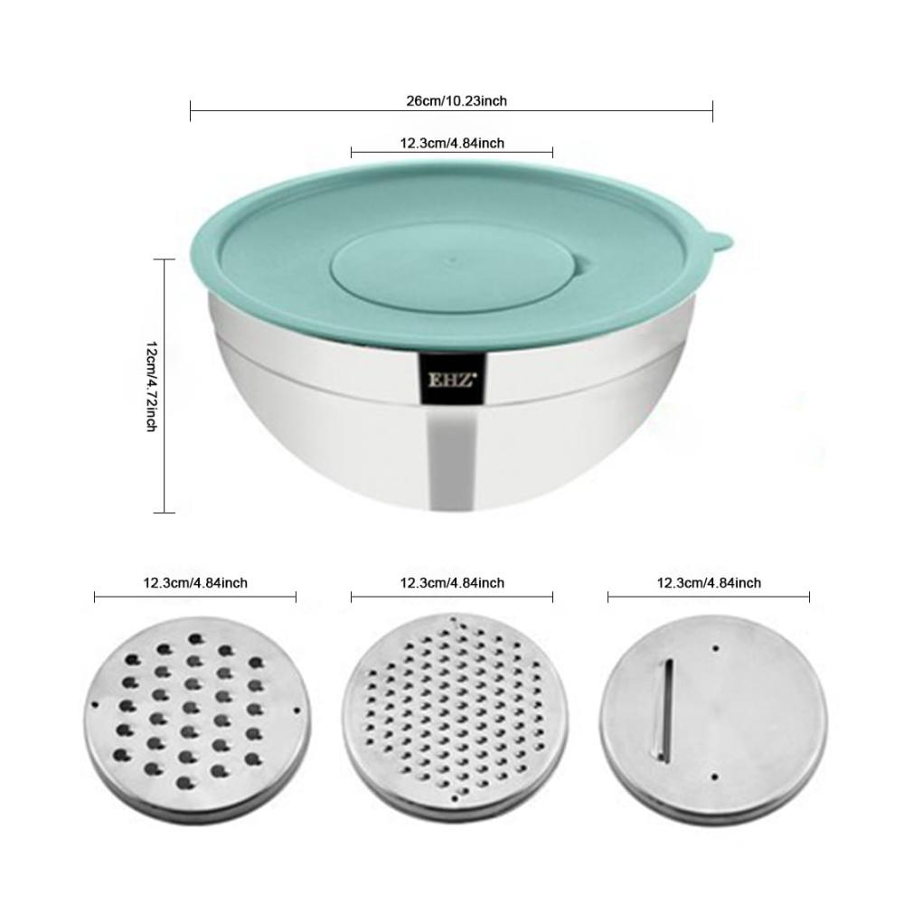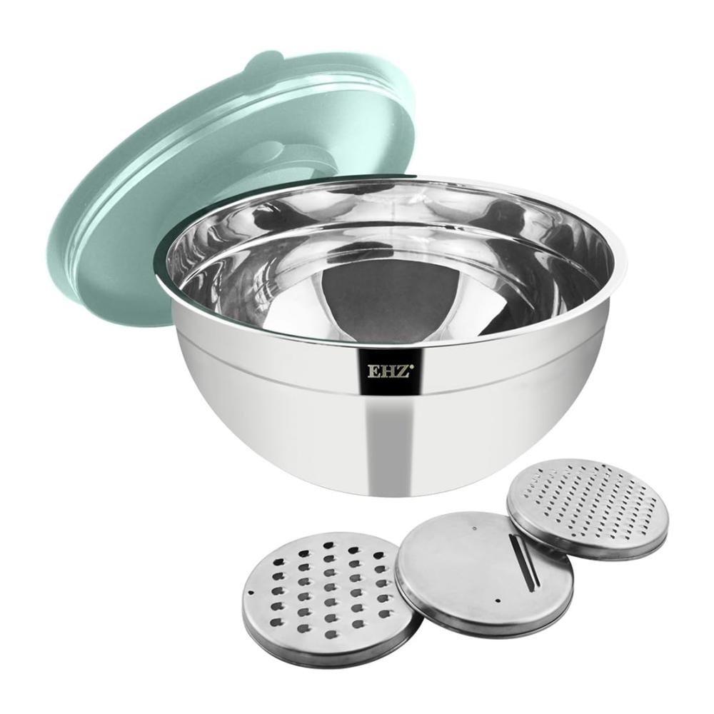 Vielseitige Schneidoptionen: Dieses Schüsselset aus Edelstahl wird mit 3 verschiedenen Zerkleinerungsaufsätzen (Schneiden/Raspeln/Hacken) geliefert, sodass Sie bequem direkt in die Schüssel schneiden oder reiben können! Keine Unordnung, keine Notwendigkeit, Schneidebretter zu reinigen.