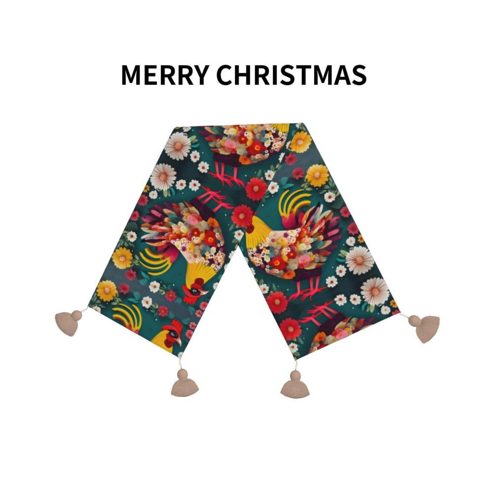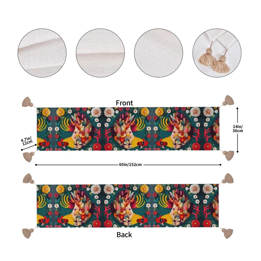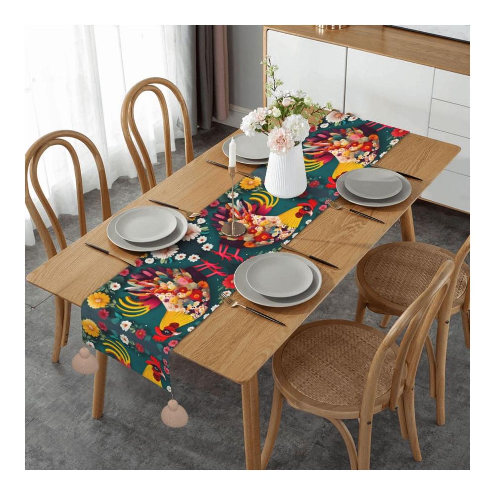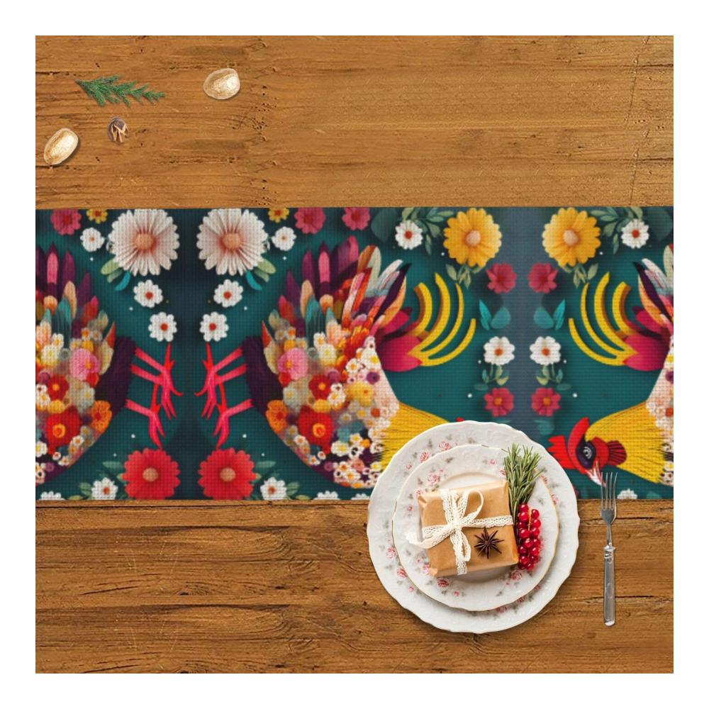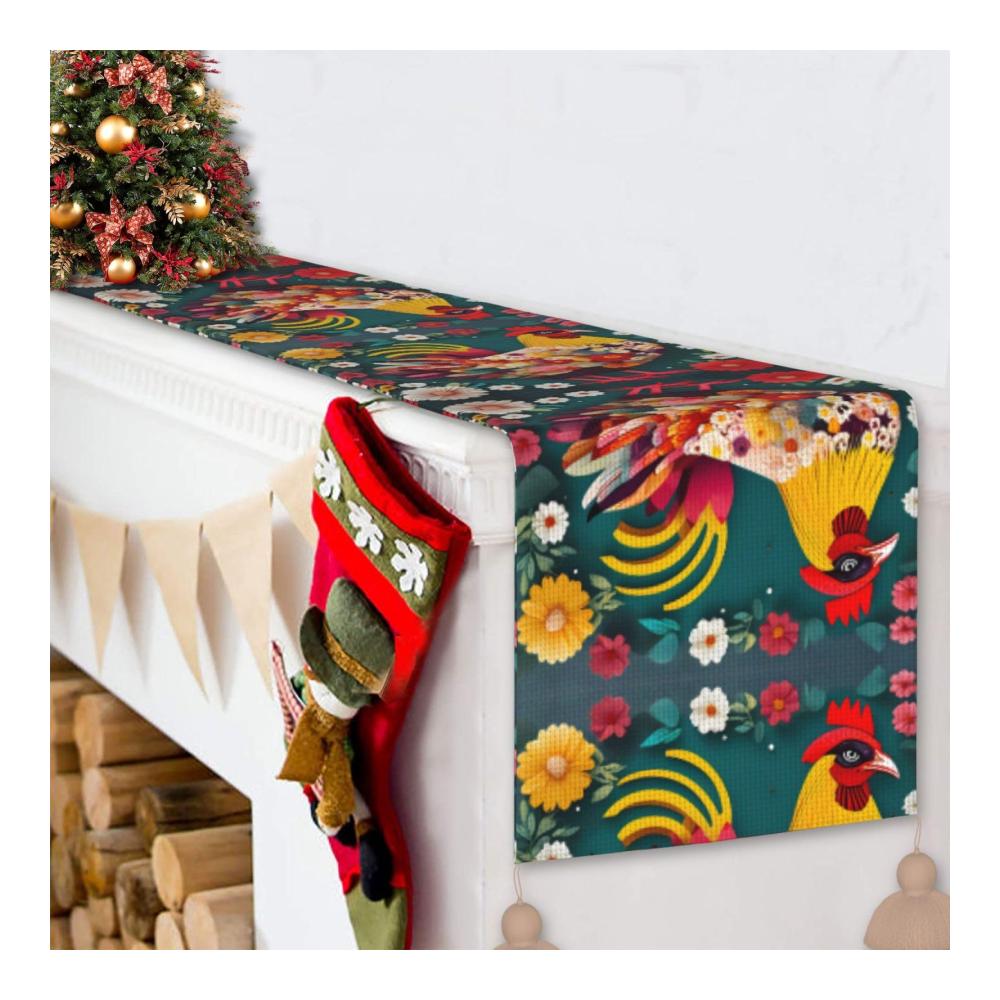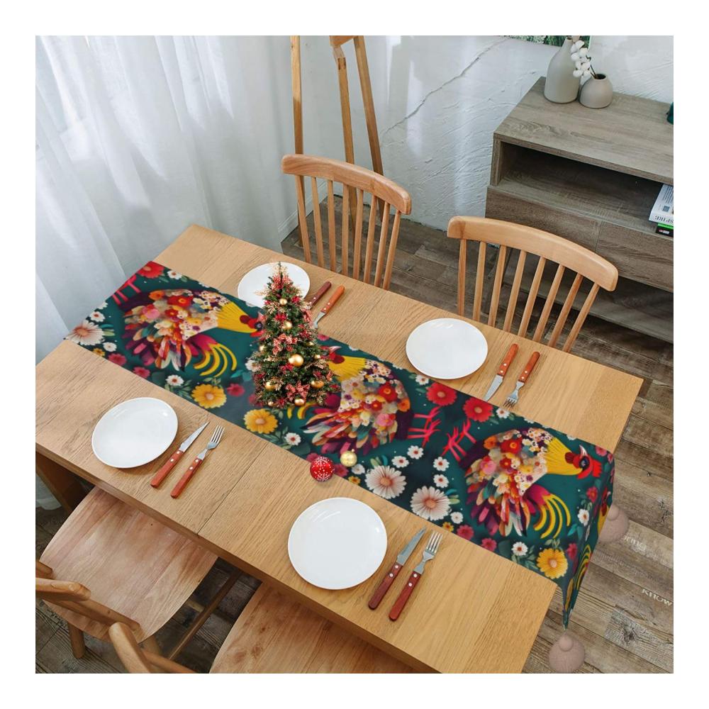 Blumen- und Herz-Huhn. Wir stellen unseren doppelseitig bedruckten Tischläufer vor – eine perfekte Mischung aus Stil und Funktionalität für Ihre Heimdekorationsbedürfnisse. Hergestellt aus doppellagigem Leinenimitat, verfügt dieser Tischläufer über eine dicke und stabile Konstruktion, die seine Langlebigkeit und Verschleißfestigkeit gewährleistet. Das doppelseitige Druckdesign verleiht eine einzigartige Note und macht es zu einem wahren Mittelpunkt für Ihren Esstisch oder jede andere Oberfläche. Mit einem rustikalen Bauernhaus-Stil bringt dieser Tischläufer eine einfache, aber elegante Textur in Ihren Raum und schafft eine charmante ländliche Atmosphäre. Der Stoff ist nicht nur knitterfrei, sondern weist auch eine hervorragende Hitzebeständigkeit auf, wodurch er für verschiedene Szenarien wie Hochzeiten, Häuser oder Urlaubsveranstaltungen geeignet ist. Eines der herausragenden Eigenschaften dieses Tischläufers ist seine einfache Wartung. Das Polyester-Material ermöglicht eine einfache Reinigung und sorgt dafür, dass verschüttete Flüssigkeiten oder Flecken mühelos entfernt werden können. Darüber hinaus ist der Tischläufer sehr langlebig, um sicherzustellen, dass er Ihre Dekoration für eine lange Zeit aufwertet.