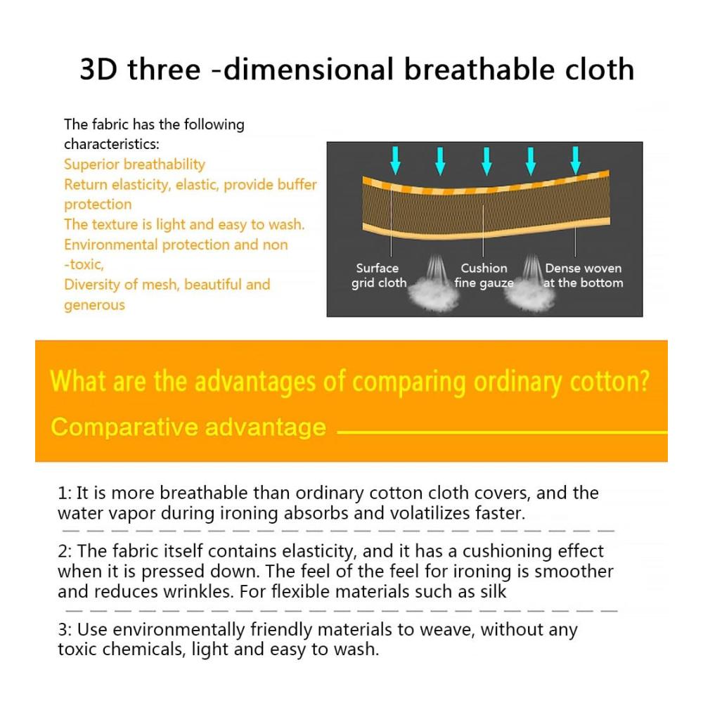 [Hochwertige Materialien] Der Bügelbrettbezug besteht aus einem dreidimensionalen, atmungsaktiven 3D-Stoffbezug, 3 Schichten Verteilung, atmungsaktiv, Wärmeableitung und Elastizität
