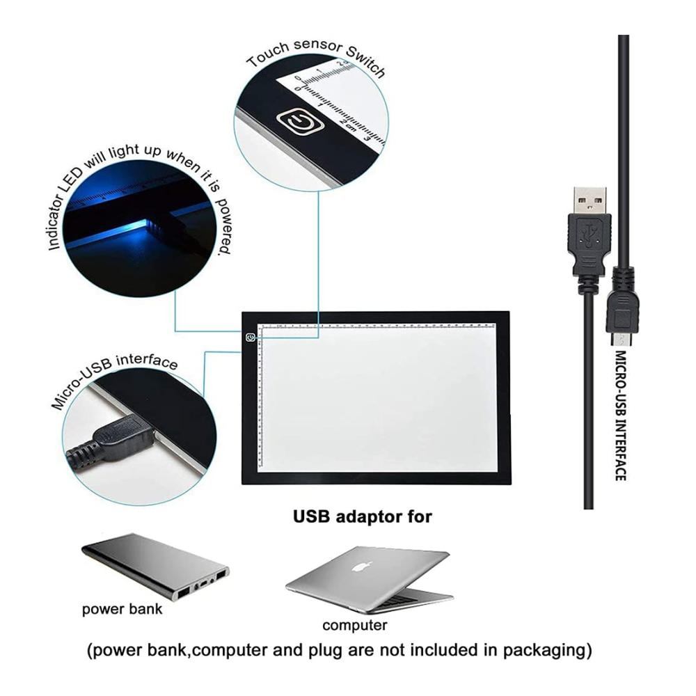 USB-Stromeingang: Das A3-Lichtpanel verwendet ein USB-Kabel zum Anschluss der Stromversorgung, wodurch der Zugriff auf jeden USB-Port wie USB-Ladegerät, Computer, Laptop oder mobile Stromquelle erleichtert wird.